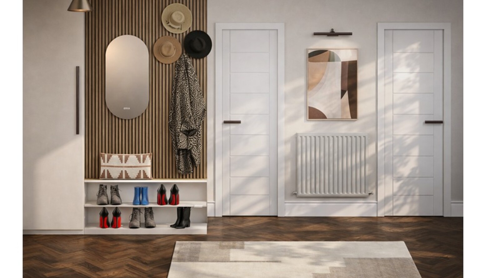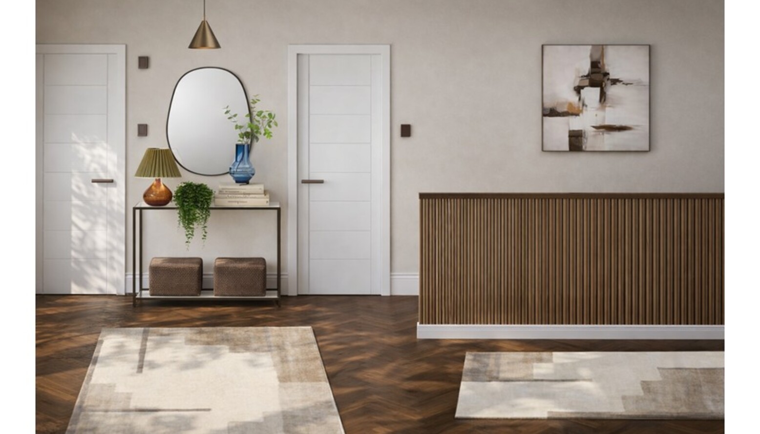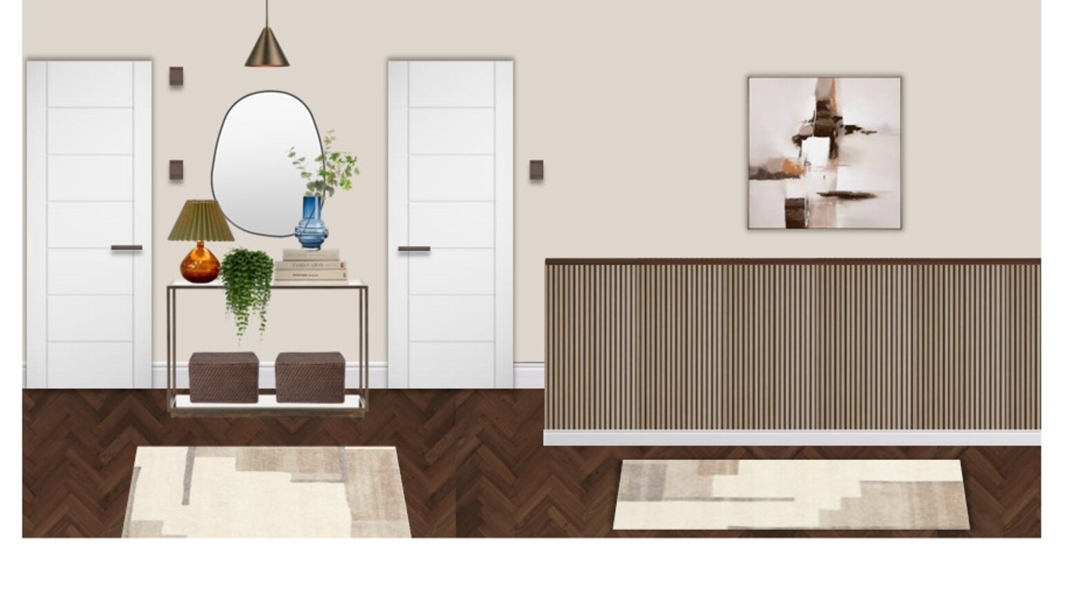 The hallway showcases a blend of contemporary and natural elements, characterized by warm tones and structured shapes.