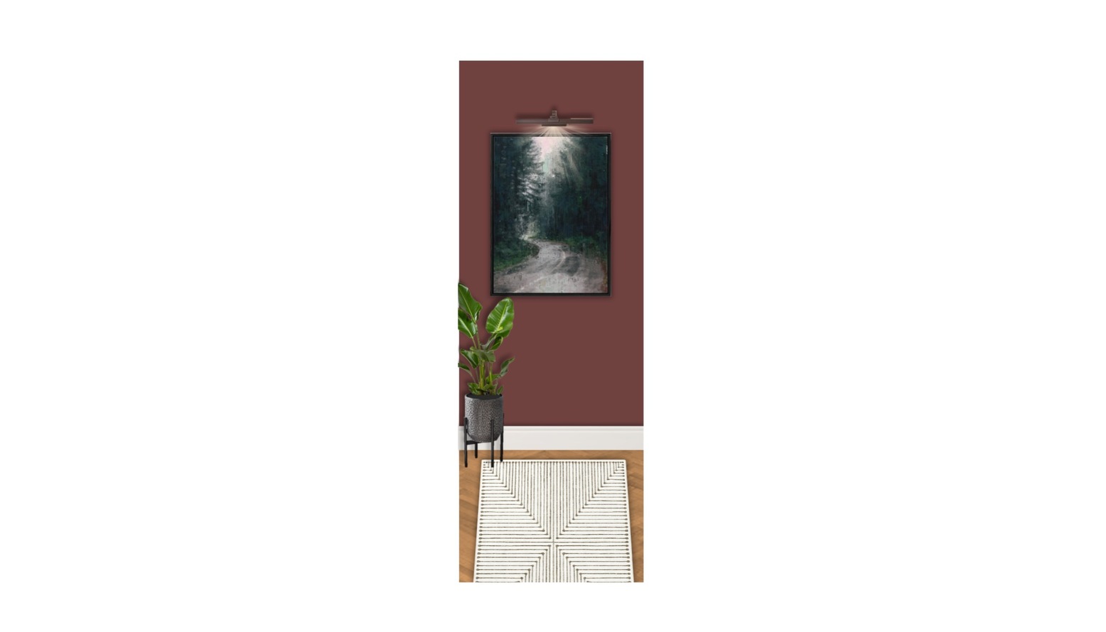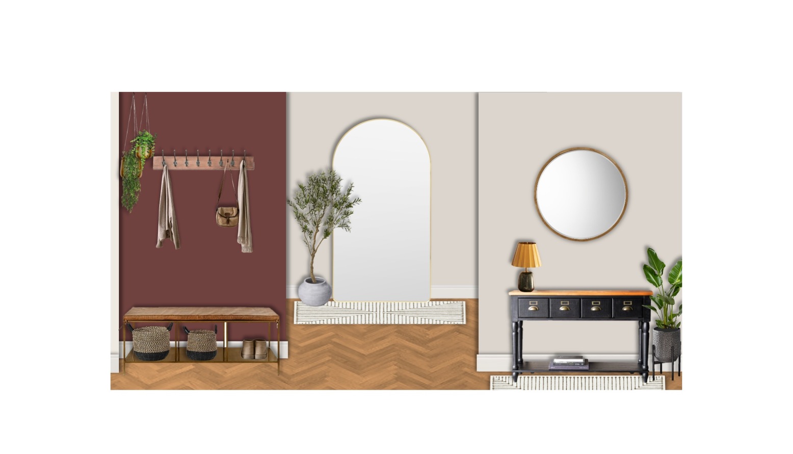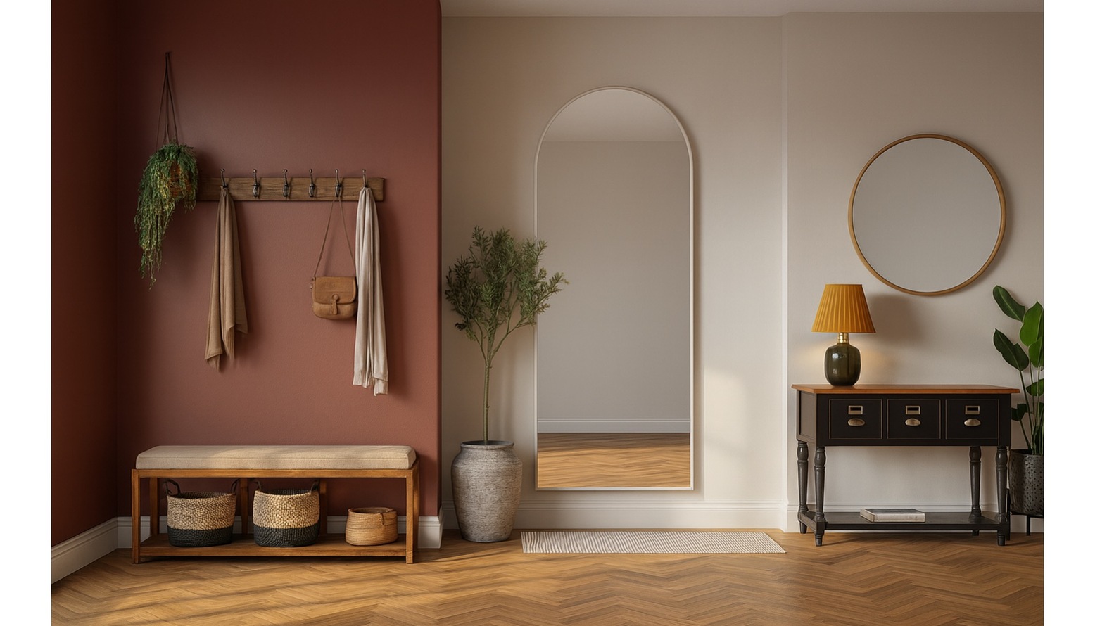 The hallway features a captivating color palette with a warm earthy tone accentuated by a muted neutral background. The walls exhibit a rich terracotta hue, creating a bold statement juxtaposed against a softer beige in other areas. A sleek arch-shaped mirror is mounted on one wall, promising to reflect natural light and visually enlarge the space.
