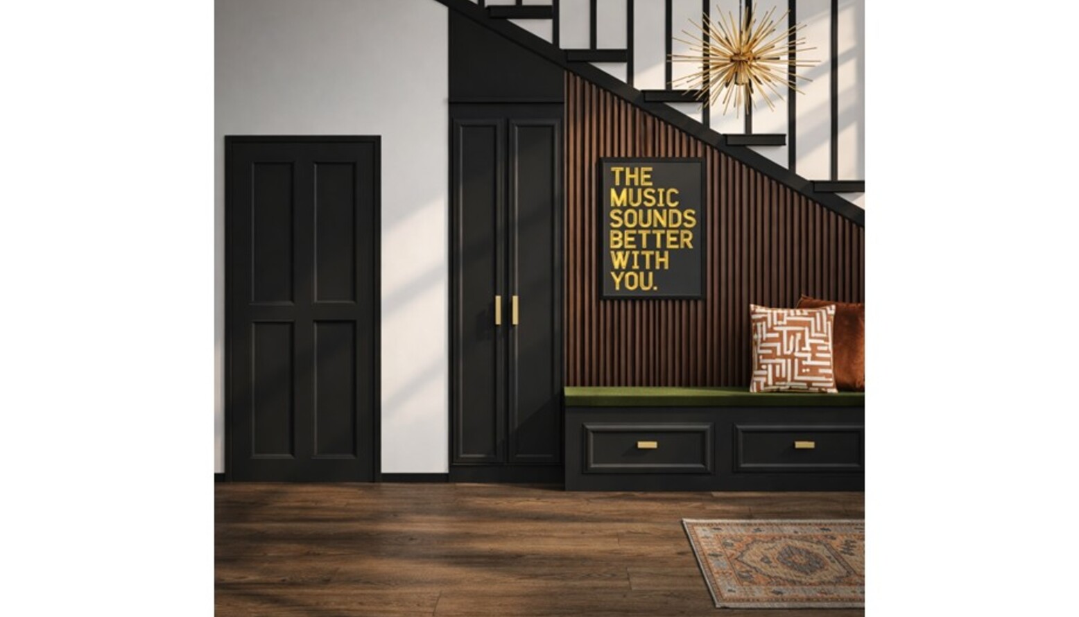 At the base of the staircase, a cozy green bench offers both comfort and functionality, accented by decorative pillows that add texture and warmth.