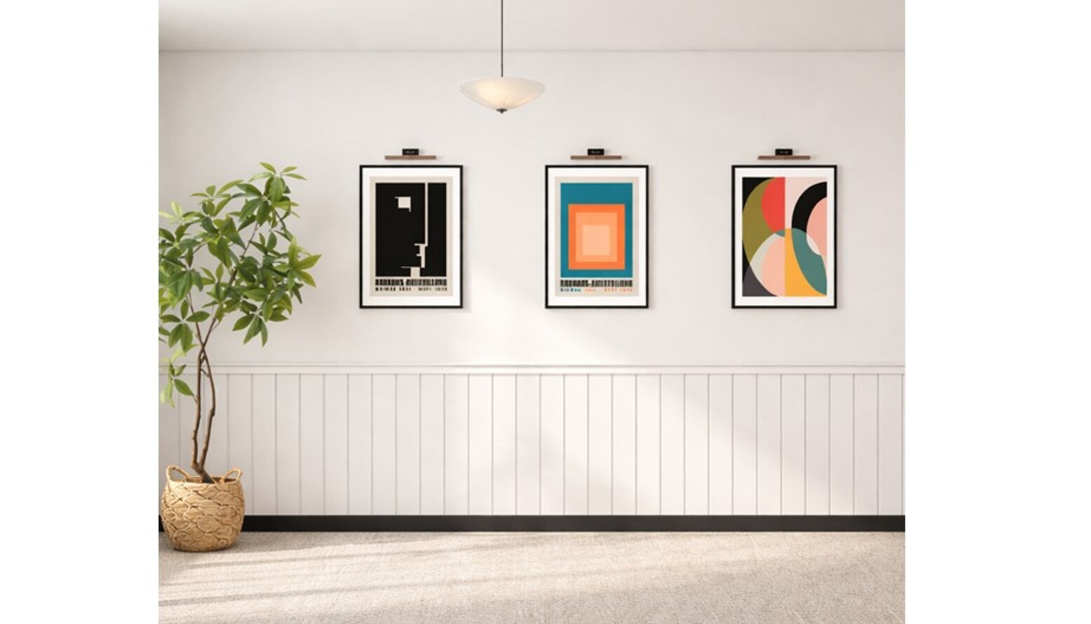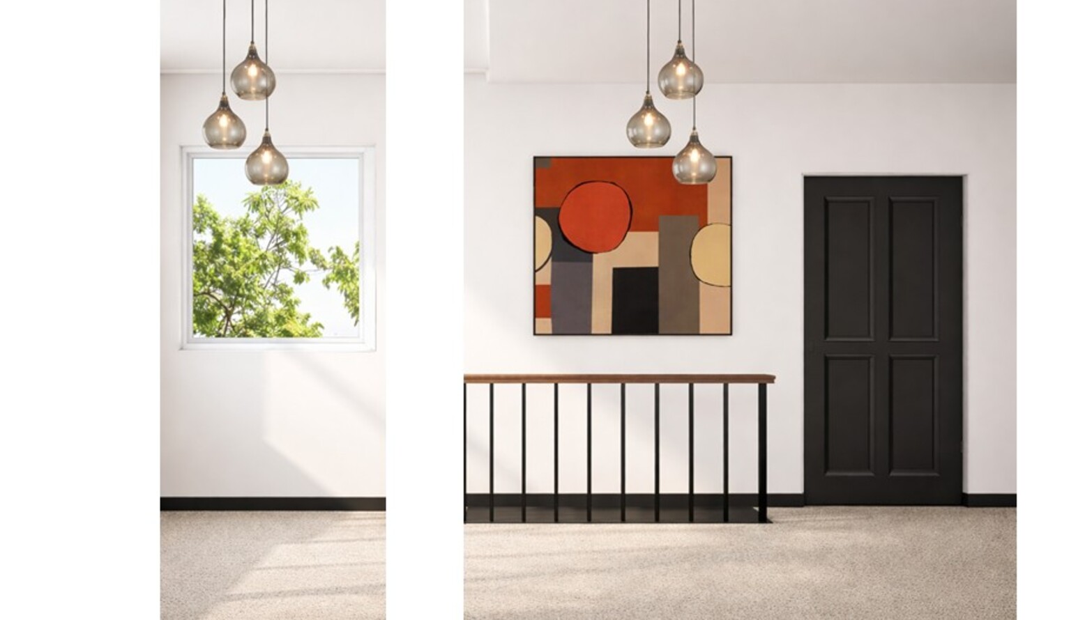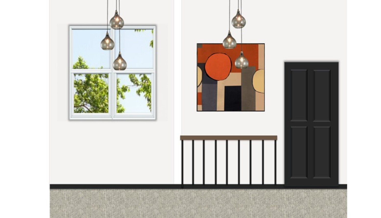 Finishing touches include stylish hardware on closet doors and a hint of personality with the Mid Century Abstract II Framed Canvas, creating a warm and stylish welcome into the home.