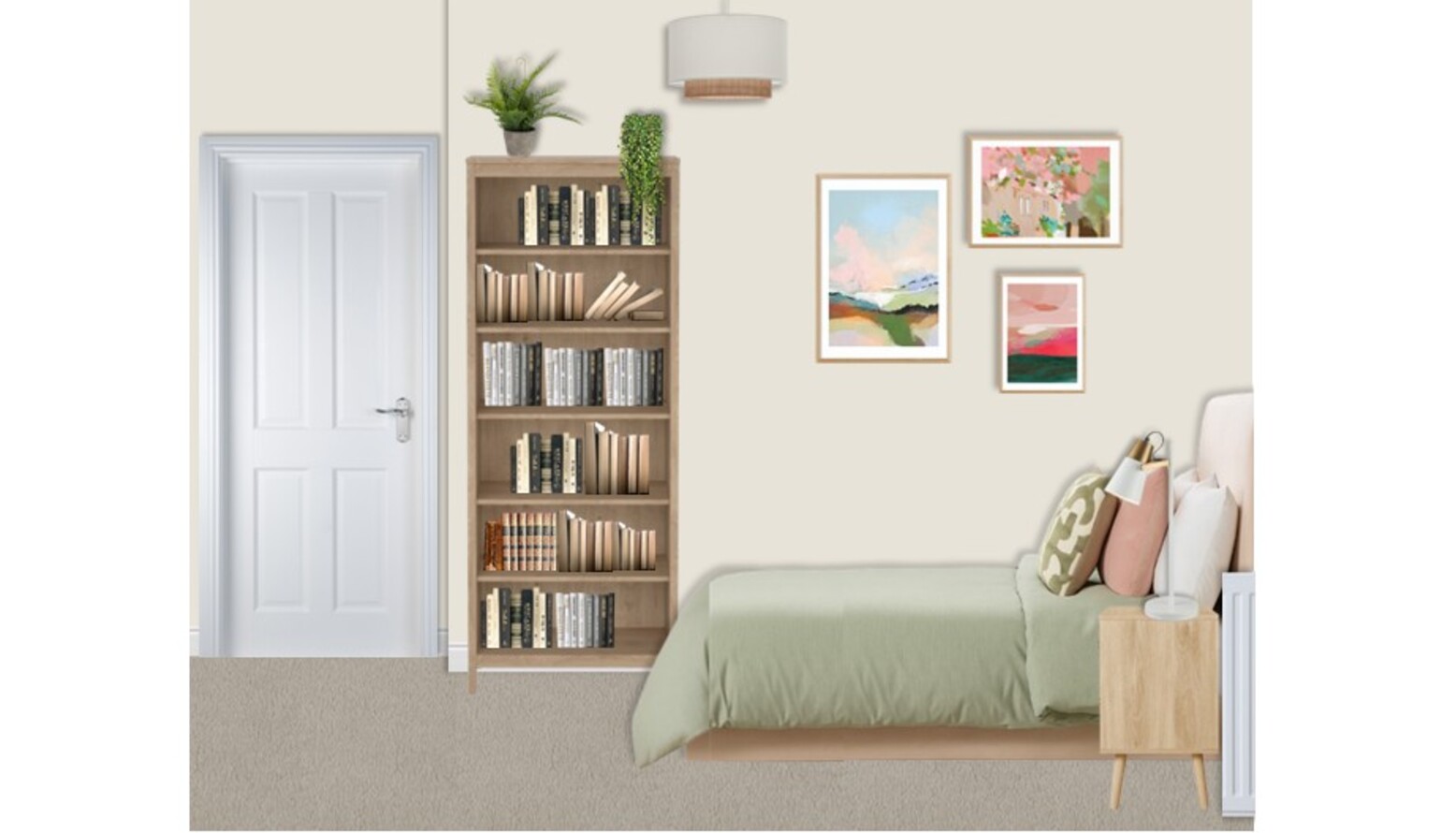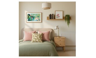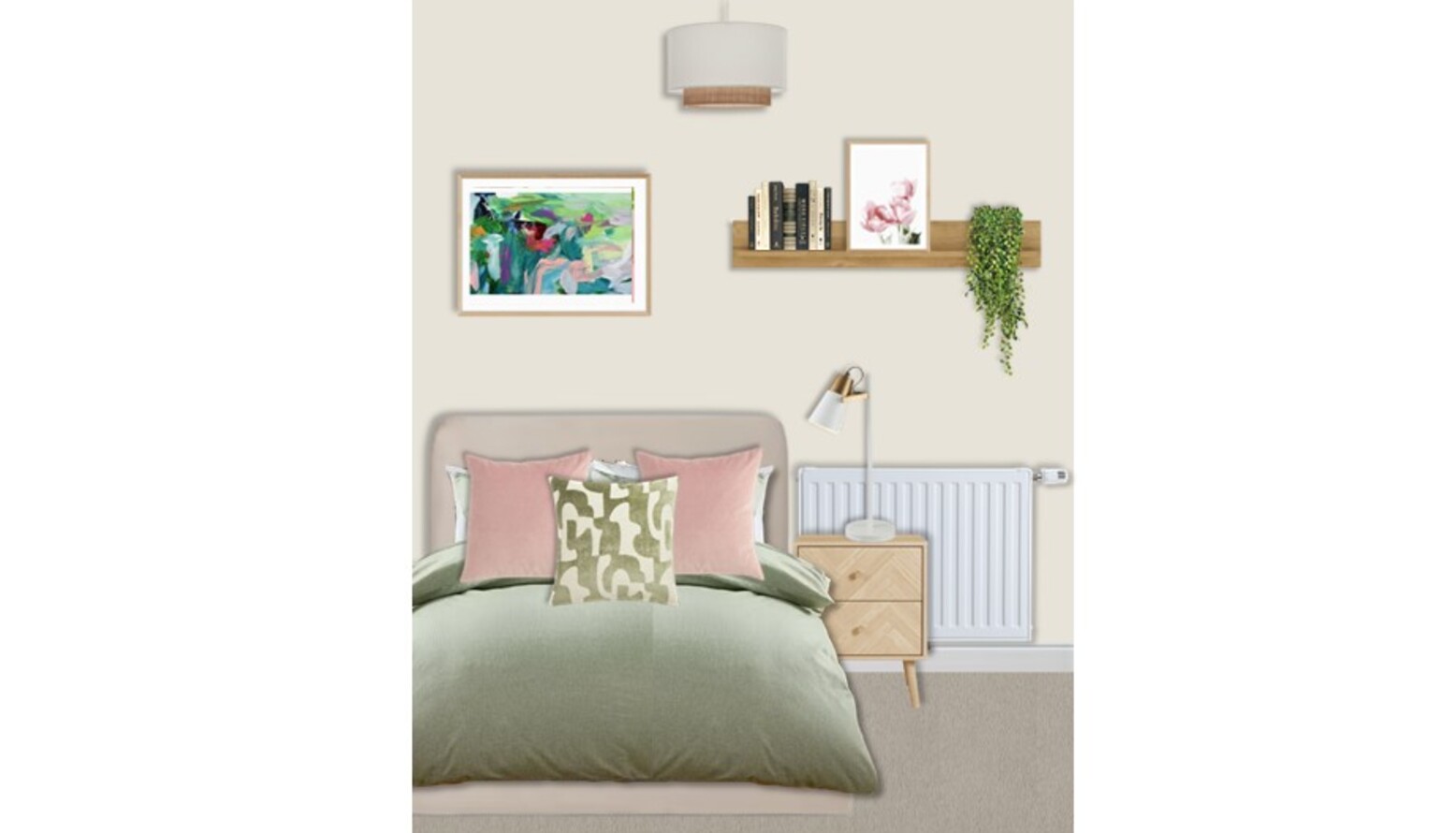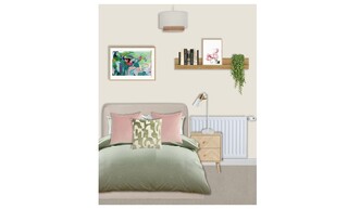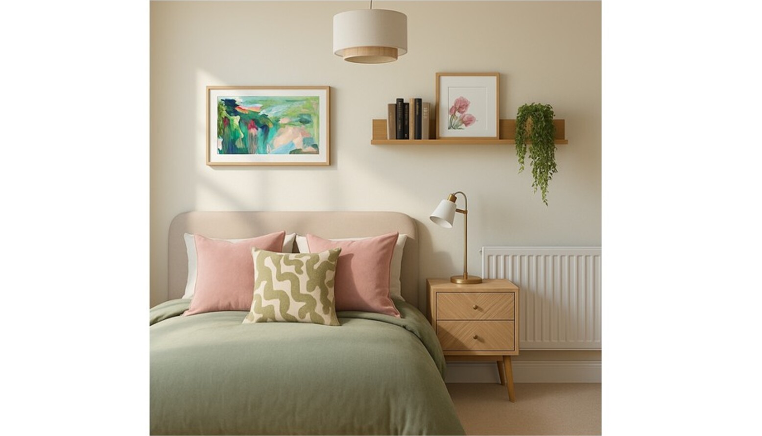 This cozy bedroom showcases a soft, inviting palette prominently featuring a bed with a plush upholstered frame in a calming mink hue. The bed is adorned with a variety of cushions, including two pink ones and a patterned green accent cushion, all layered over a gentle green throw, creating a warm atmosphere.