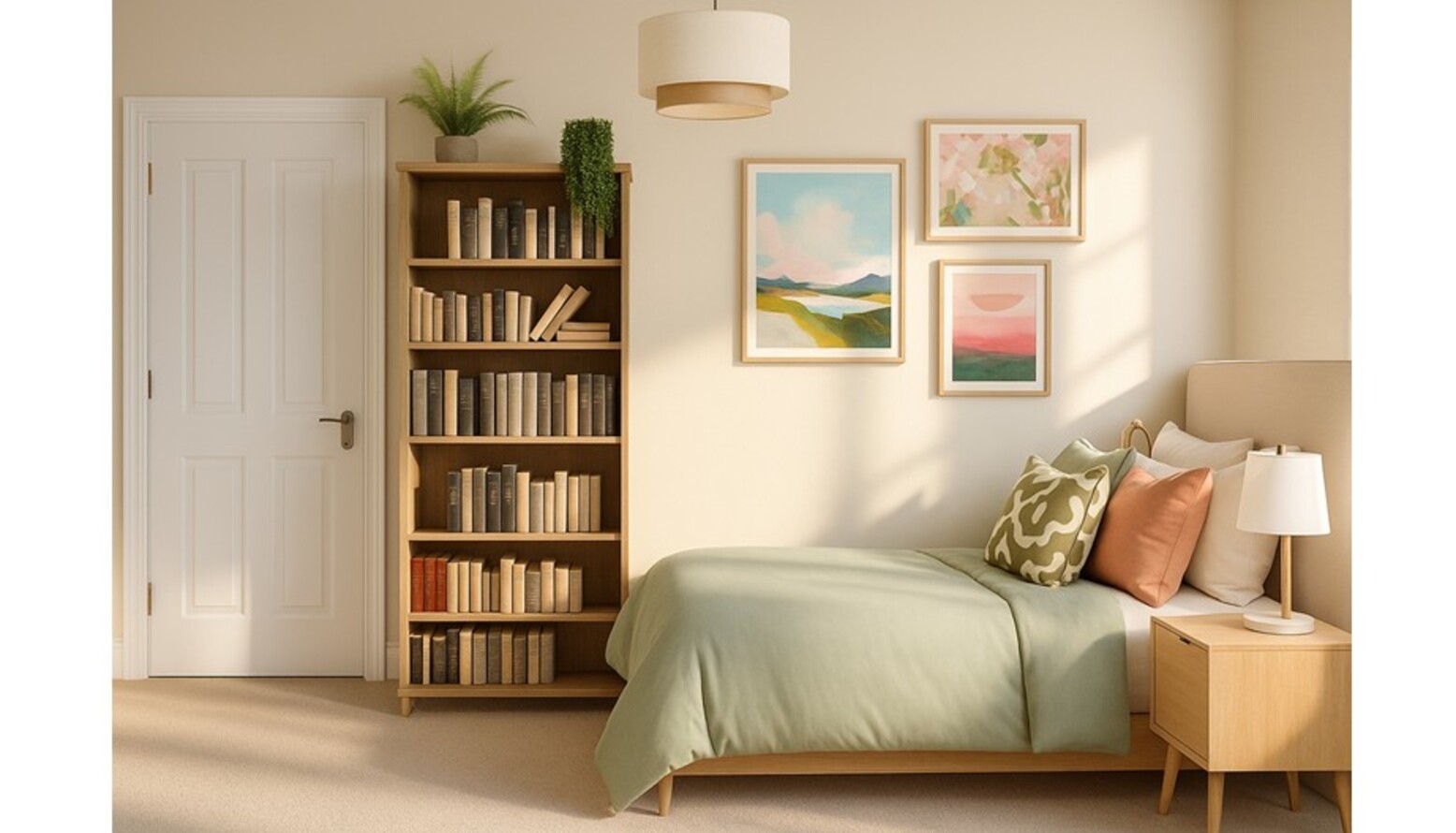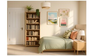 Adjacent to the bed, a stylish bedside table in a light oak finish complements the decor, offering a sleek lamp with brass accents for bedtime reading. Above the table, a wall-mounted shelf displays a few books alongside framed artwork, bringing personality to the space. The colorful abstract piece and a floral print add a touch of artistic flair to the walls.