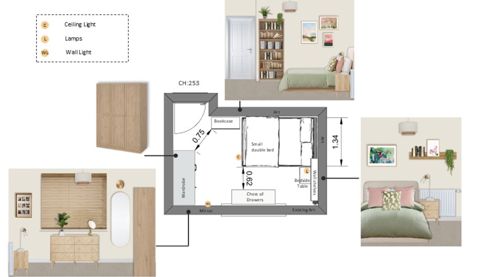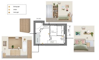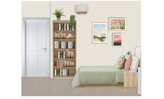 Functional elements like a wardrobe and a bookcase in matching oak finish blend seamlessly with the overall design, providing ample storage while maintaining a stylish aesthetic. Every piece, from the bedding to the art, has been thoughtfully selected to create a harmonious and unique sanctuary.