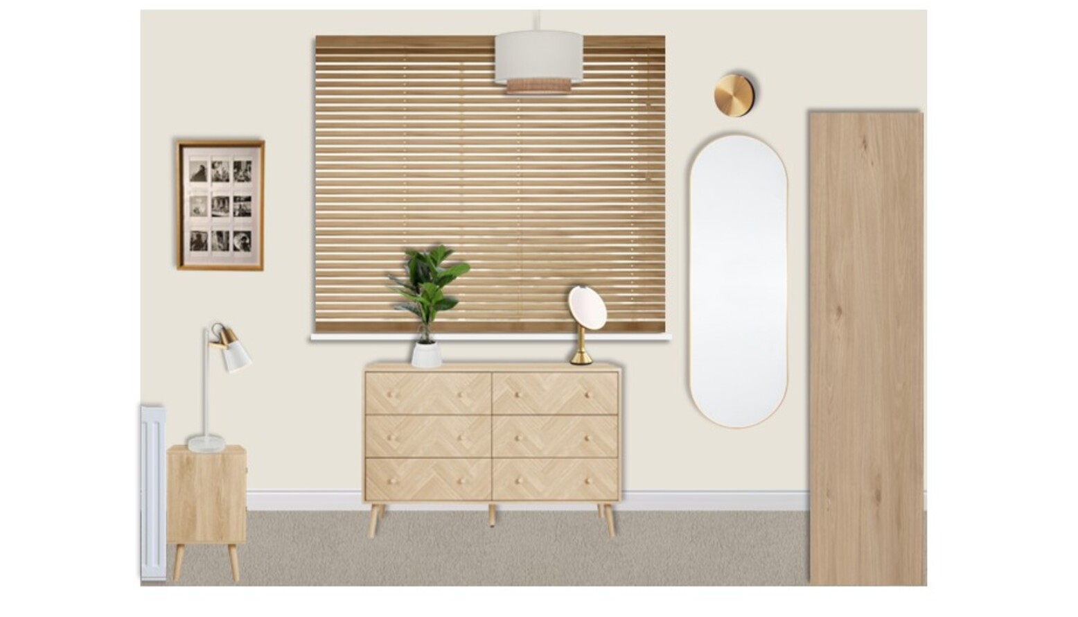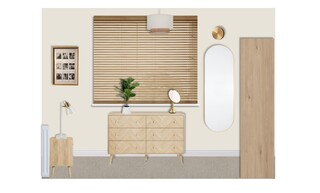 Natural light filters through the room, highlighting the soft textures and colors, while a faux plant friend adds a fresh touch. The ceiling features a bamboo lampshade, enhancing the room's airy feel. A well-placed mirror reflects light, making the room feel more expansive.