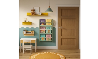 A book storage unit featuring various brightly colored books showcases playful artwork and provides an easy way for children to access their favorite titles. The unit is flanked by a cheerful yellow wall-mounted shelf displaying a teddy bear and decorative accents.