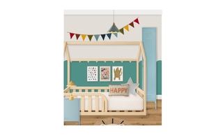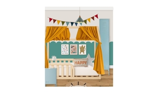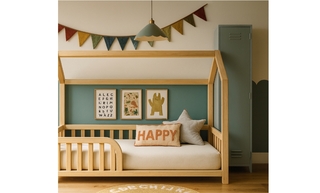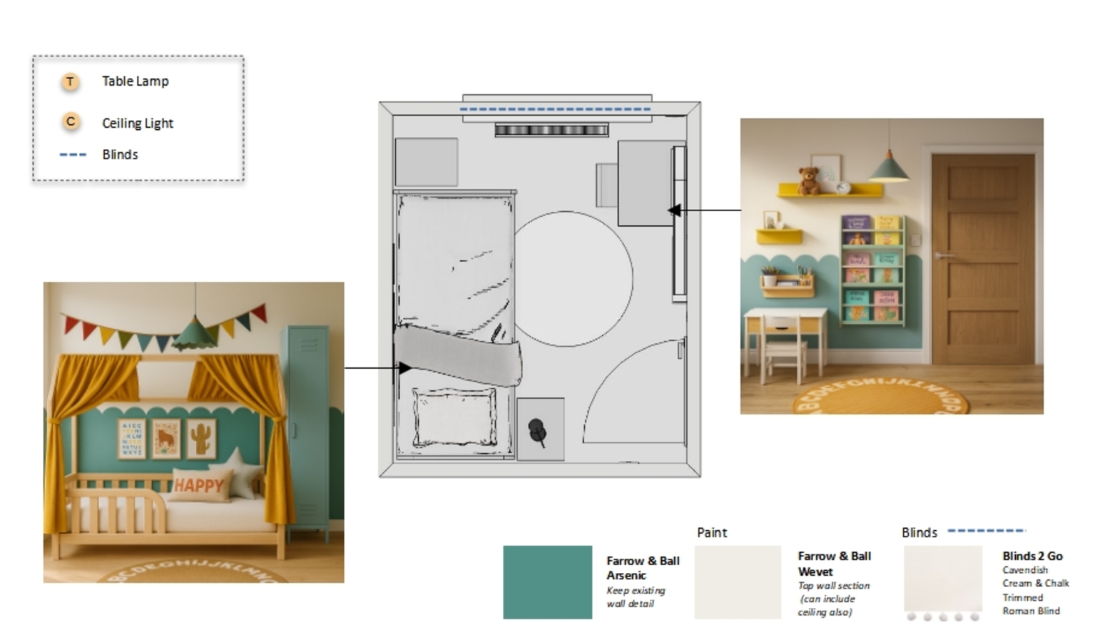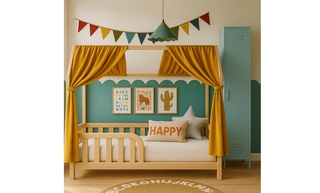 This playful children's bedroom features a bright and inviting design tailored for a child's needs. The walls are painted in a muted light green color, complemented by a scalloped section at the bottom. The natural wood flooring adds warmth to the space.