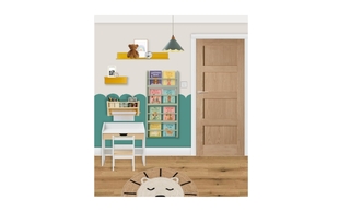 Against one wall, a chic white desk paired with a natural wood chair creates a functional workspace for creative activities. Above the desk, there is a mounted shelf holding art supplies, adding both character and practicality to the room.