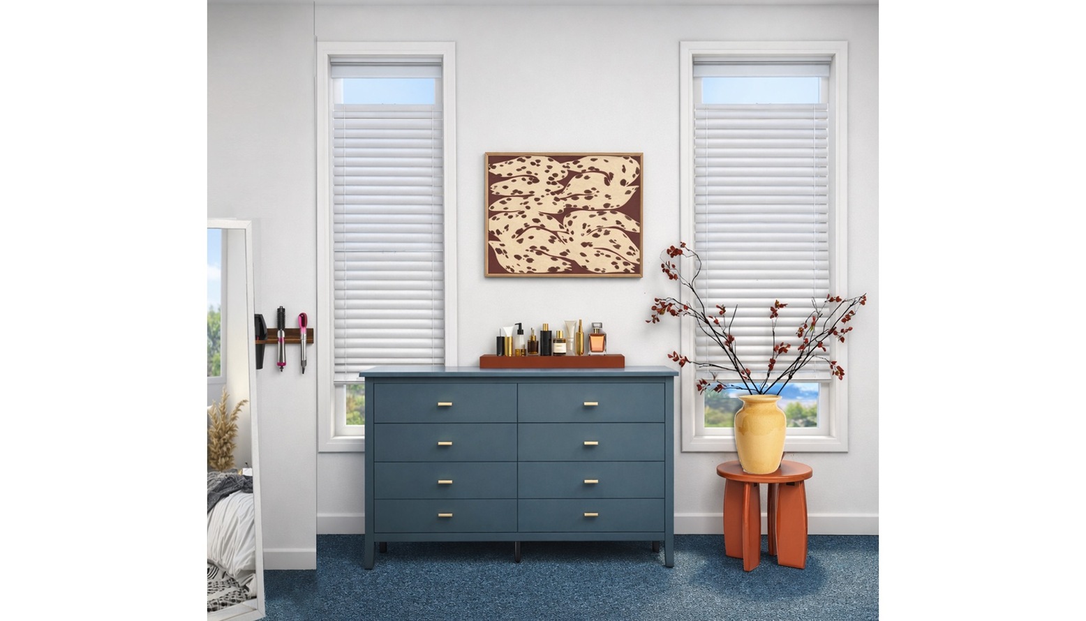 This home office is characterized by a modern and functional layout, featuring a warm color palette that enhances productivity. The focal point is the sleek Notch Desk in oak, paired with a comfortable, upholstered swivel chair with golden accents, offering both style and comfort for long working hours. Adjacent to the desk, a Format Drawer Unit in greige provides practical storage solutions while maintaining a cohesive look. On one side, a Bow 4 Drawer Chest and a tall 5 Drawer Tallboy Chest in a natural finish create a harmonious combination of storage and design. A stunning Betula Checkerboard Rug in orange and multi-tones adds a layer of texture to the space, perfectly complementing the overall aesthetic. Decorative elements include a Cove Abstract Framed Canvas Print that introduces color and personality, along with a Reactive Glaze Stoneware Urn Vase showcasing faux plants, adding life and vibrancy to the room. Natural light floods in through the window, enhancing the airy feel of the space, while modern wall-mounted shelving provides additional display options. The overall ambiance is both inviting and inspiring, ideal for a productive work environment.