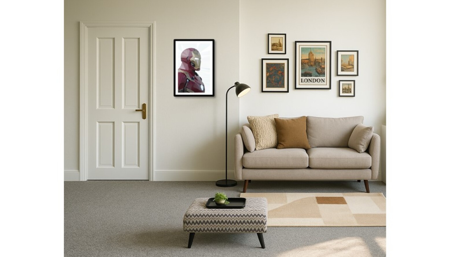 The walls are adorned with framed artwork and prints, showcasing vibrant colors and urban landscapes, which add character to the room. Below, a copper-toned rug introduces warmth and texture, grounding the space beautifully.
