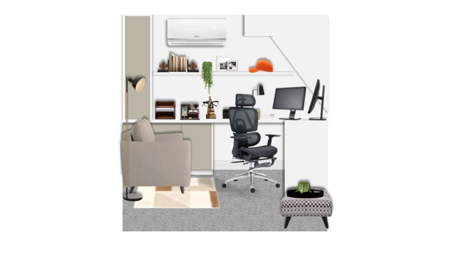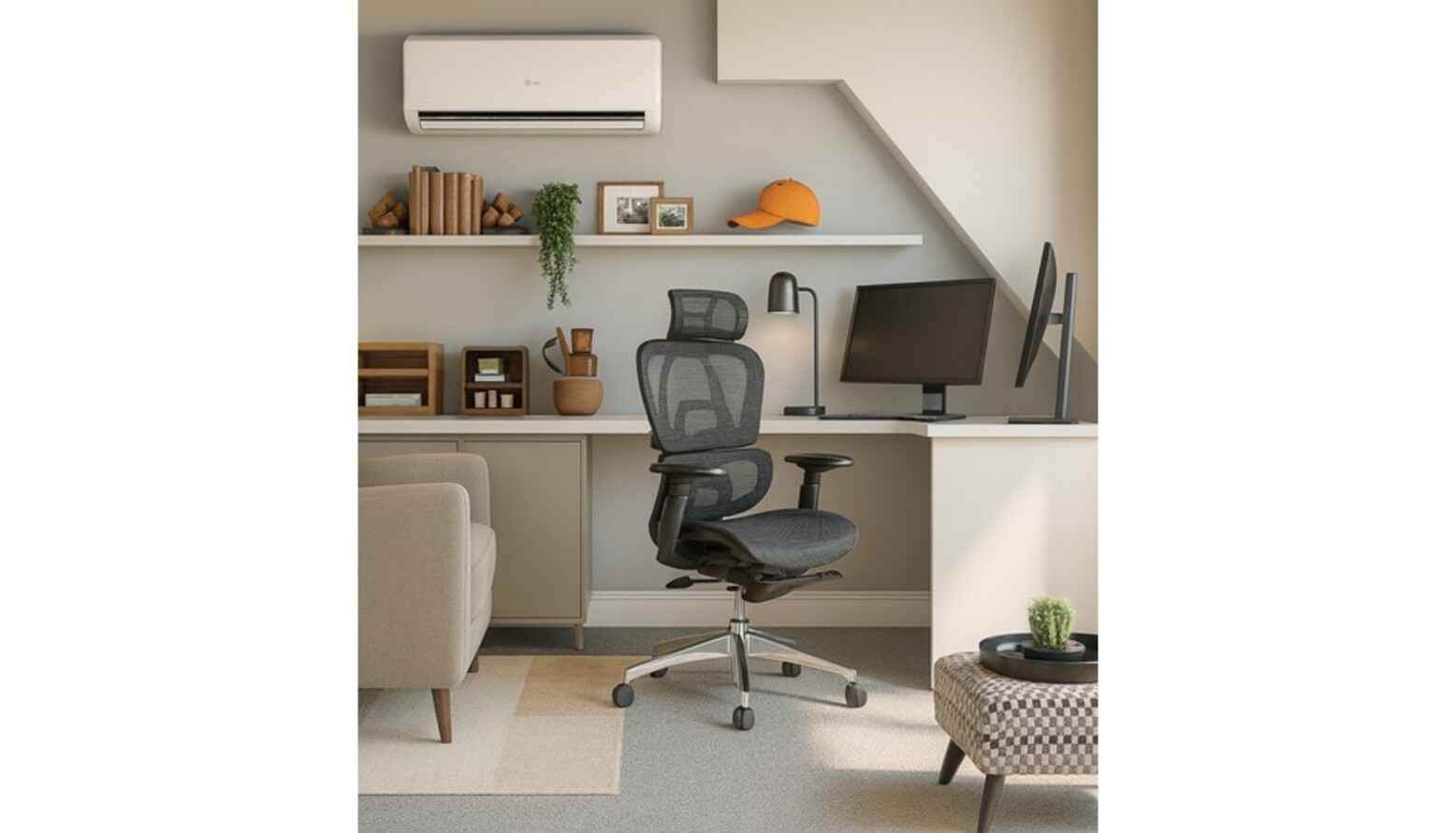A small, chic ottoman with a patterned facade serves as an additional seating option or a coffee table, further contributing to the room’s versatility. Finally, the subtle touch of greenery from a trailing plant set brings a refreshing natural element into the workspace.