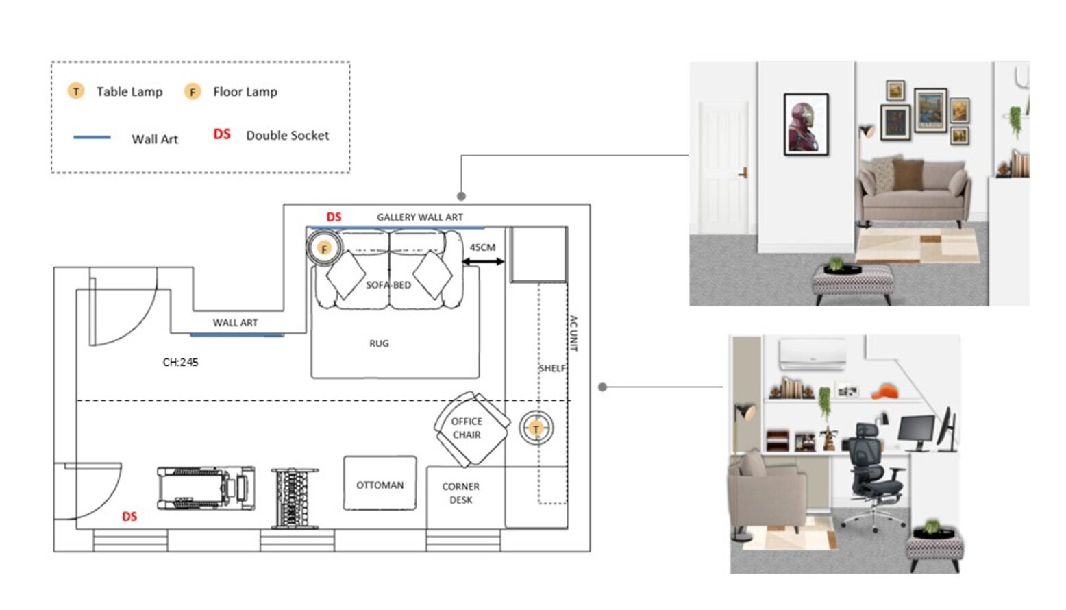 Check out this room design for our client complete with 3D visuals and floorplan.