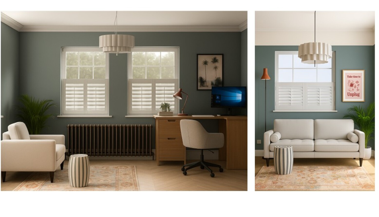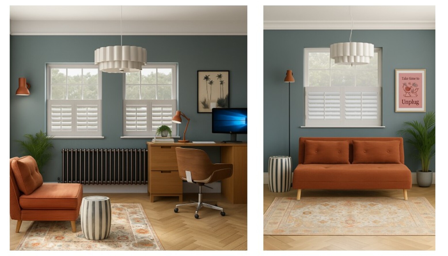 The home office is designed with a sophisticated blend of comfort and functionality. The walls are painted in a deep Inchyra Blue, creating a moody and enveloping atmosphere, while the ceiling and picture rail are finished in a crisp off-white that visually elevates the space. The trim and baseboards can either match the ceiling for continuity or use a tonal approach with the wall color for a cocoon-like effect.