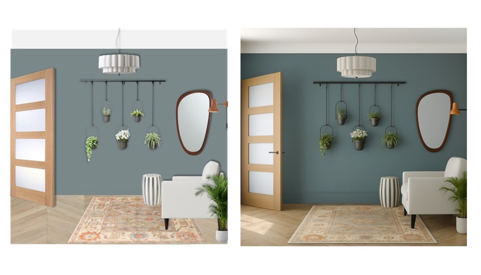 The flooring is adorned with a large, neutral rug that grounds the room, made from natural jute and featuring a subtle geometric pattern. This allows the rich color of the walls to take center stage without overwhelming the senses.