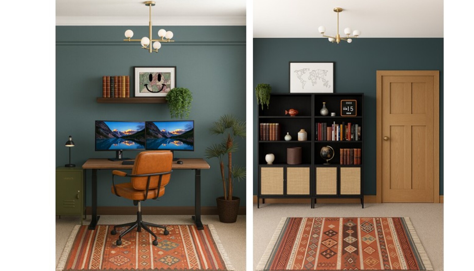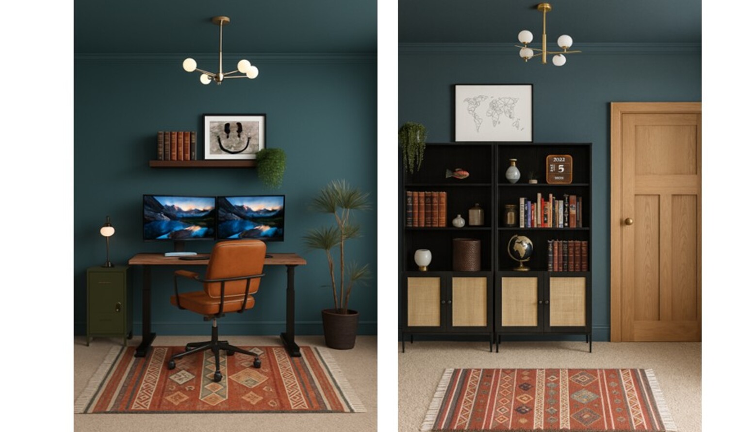 This home office exudes a blend of modernity and comfort, featuring walls painted in a rich teal that provides a calming backdrop.