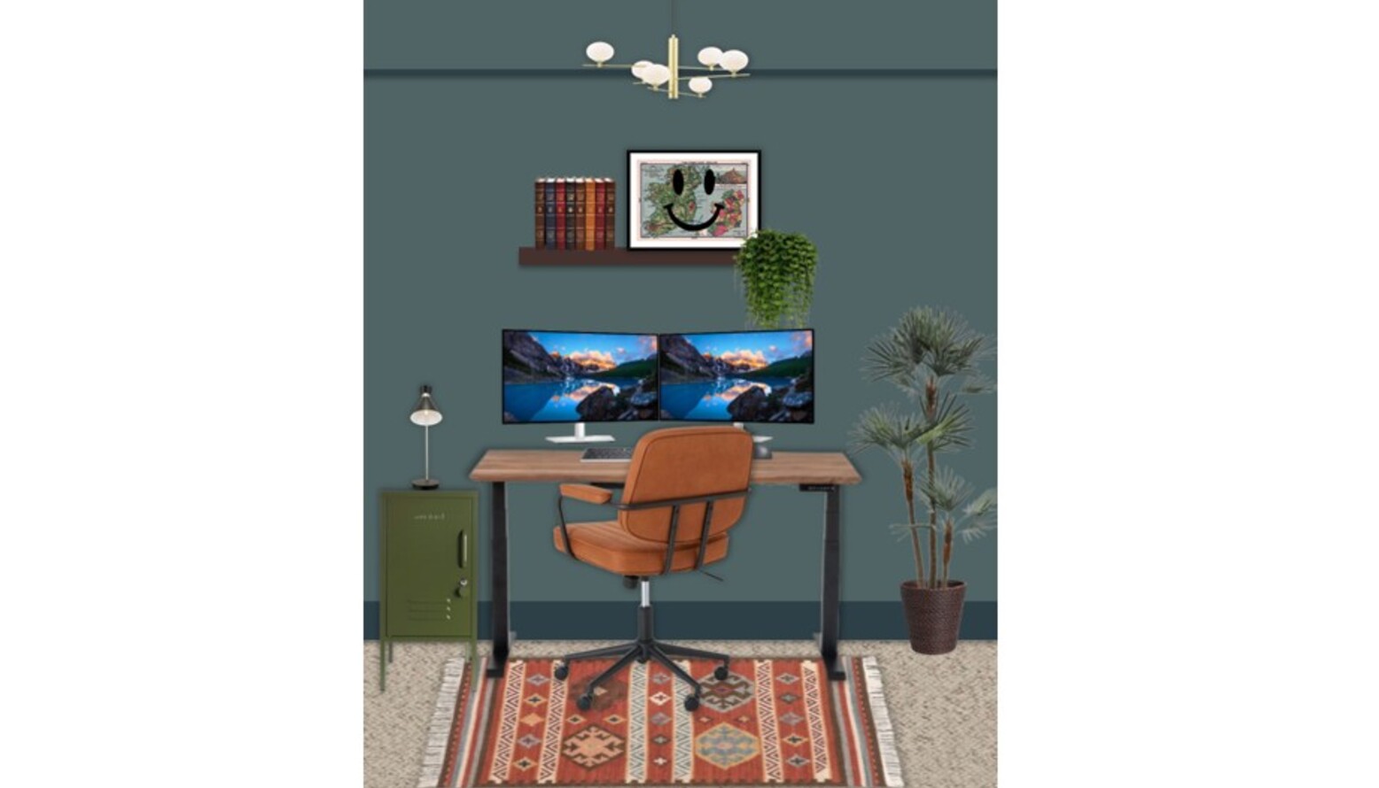 Overhead, a satin gold ceiling pendant with opal glass shades casts an inviting glow, enhancing the room's ambiance. The room is further decorated with carefully chosen artwork, including a whimsical smiley face and a geometric world map, adding personality to the office.
