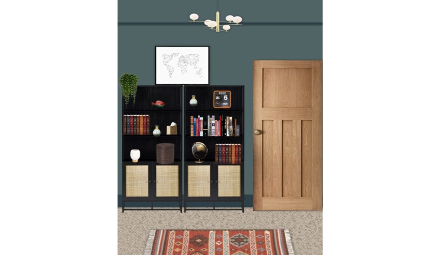 A tall black bookcase stands against the wall, showcasing a mix of books and decorative items, including a globe and layered baskets that offer a chic touch.