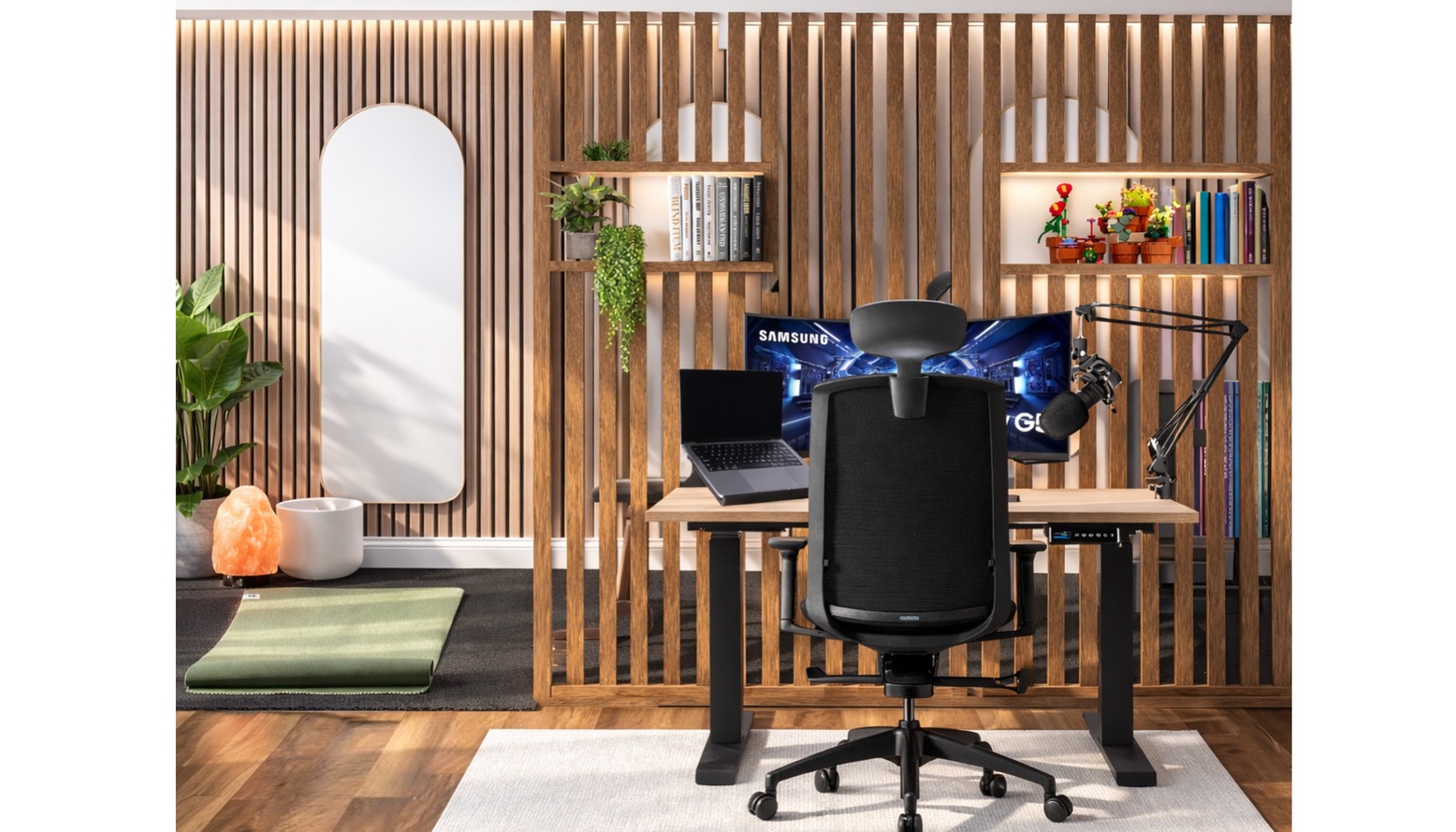 Firstly, think about how you work in the space. Are you mostly at your desk? Do you need to be able to get up and down a lot? Maybe you have the habit of putting your feet on the desk when taking calls? Prioritize your comfort by allowing yourself space and make sure to invest in a decent desk chair that allows you to be as comfortable as possible while working at your desk.