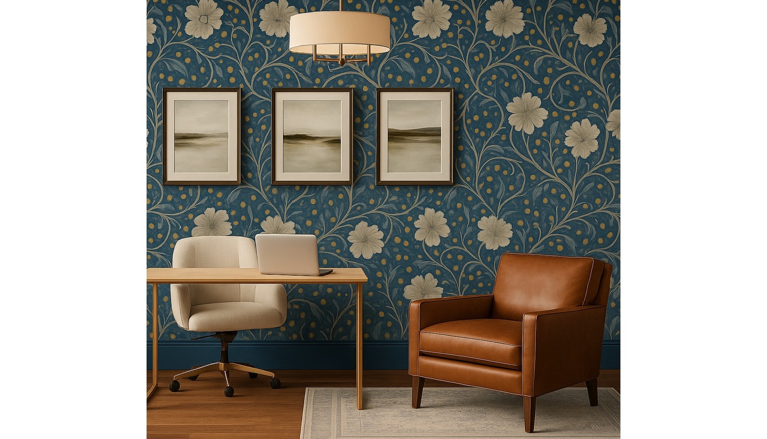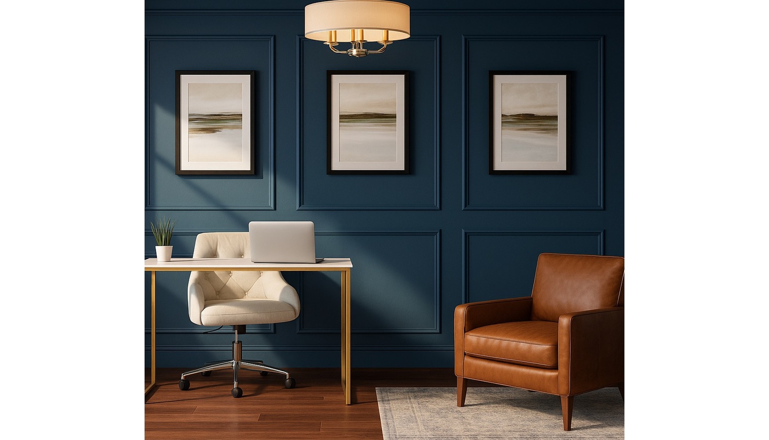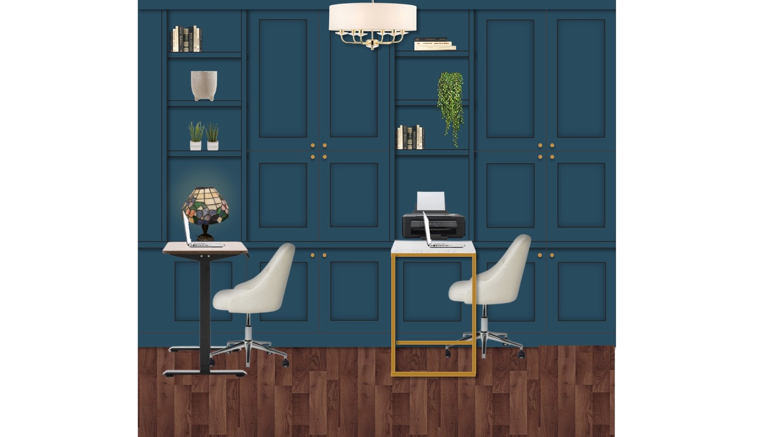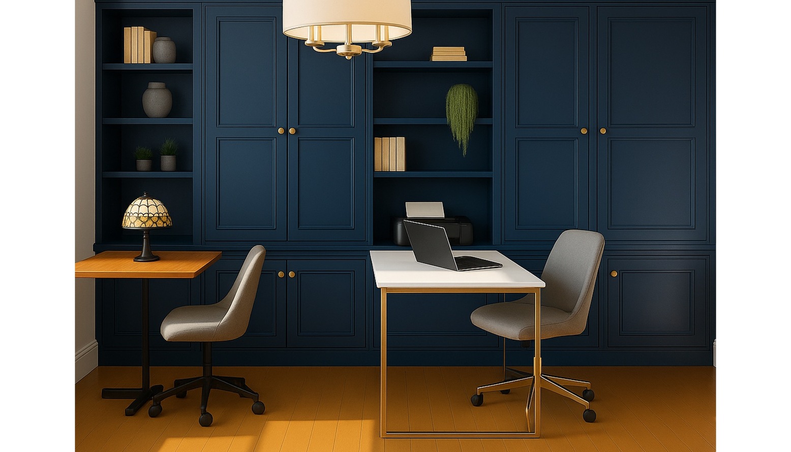 The home office exudes a contemporary charm, characterized by deep blue cabinetry that provides ample storage and a sophisticated backdrop. The shelving is adorned with stylish decor elements like sleek planters and neatly arranged books, enhancing the room's organization and aesthetic appeal.