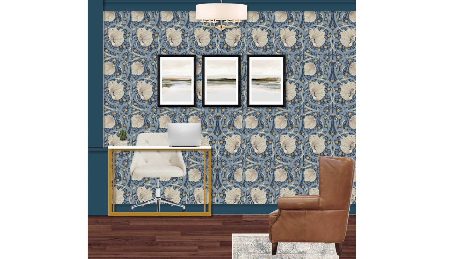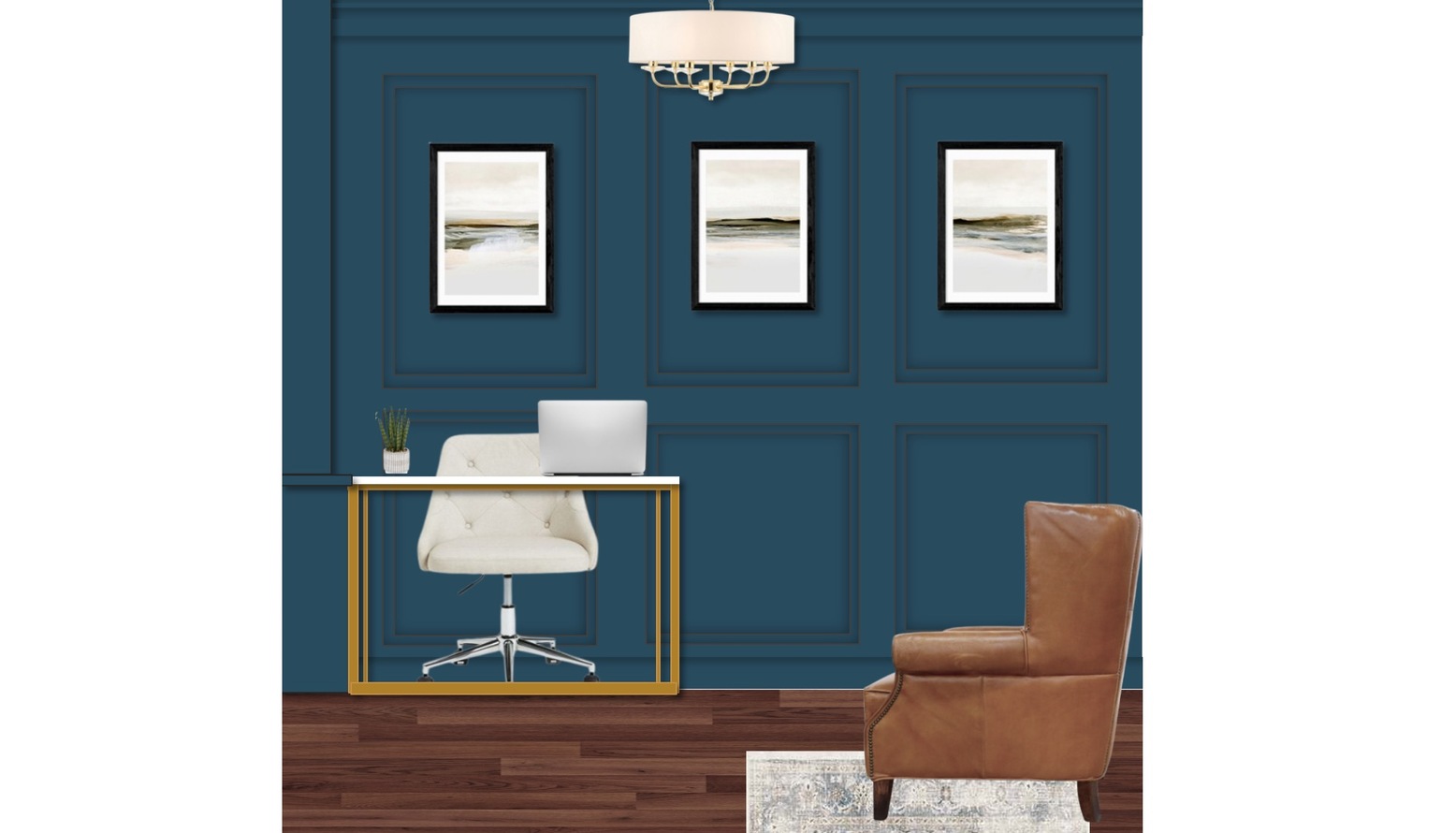 In the center, a modern white writing desk with a gold frame is complemented by a comfortable office chair, offering ergonomic support. Adjacent to the desk, a small side table with a natural wood finish adds versatility, perfect for additional workspace or small meetings.