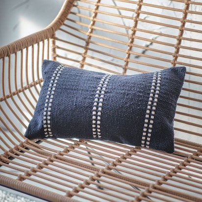A plush Aissa 2 Seat Sofa Bed in Pumice House Basket Weave provides both comfort and functionality, complemented by an array of decorative cushions in various shades of blue, gold, and cream.