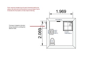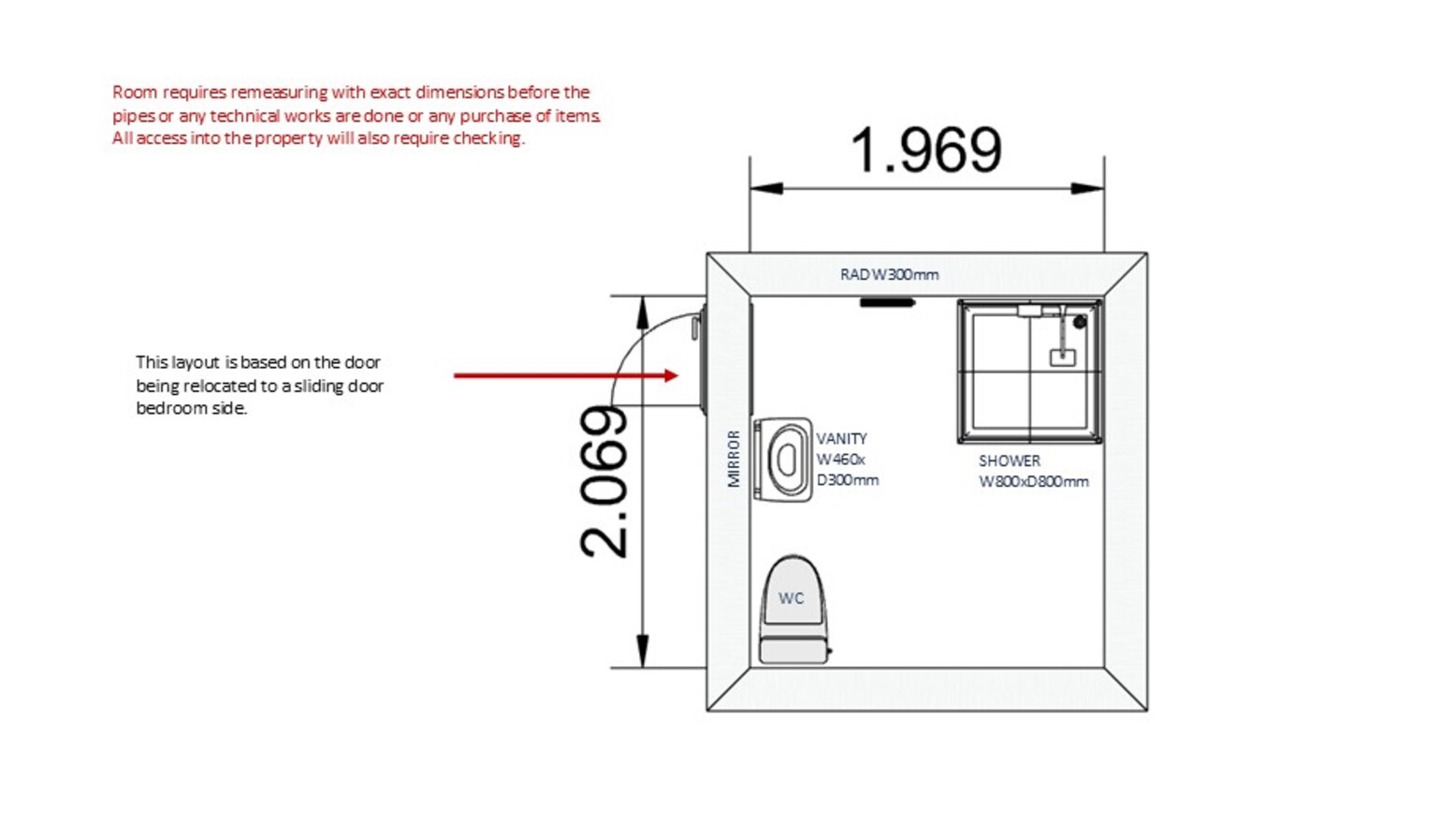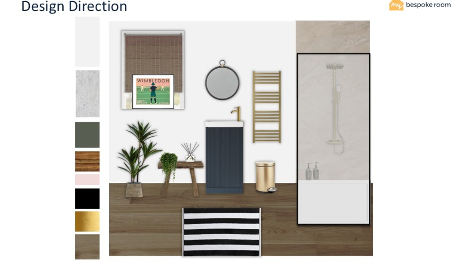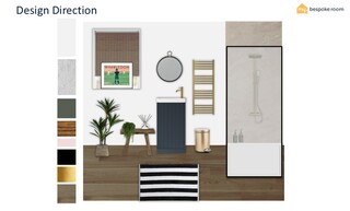 Strategically placed shelving provides both practicality and visual interest, adorned with stylish accessories. A striking black round mirror accentuates the compact space, while the heated towel rail in brushed brass effortlessly combines luxury and comfort. The overall design is wrapped up with thoughtful details, such as the striped bath mat and delicately scented diffuser, ensuring the space feels inviting and serene.