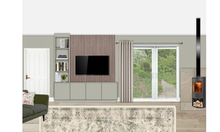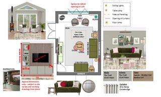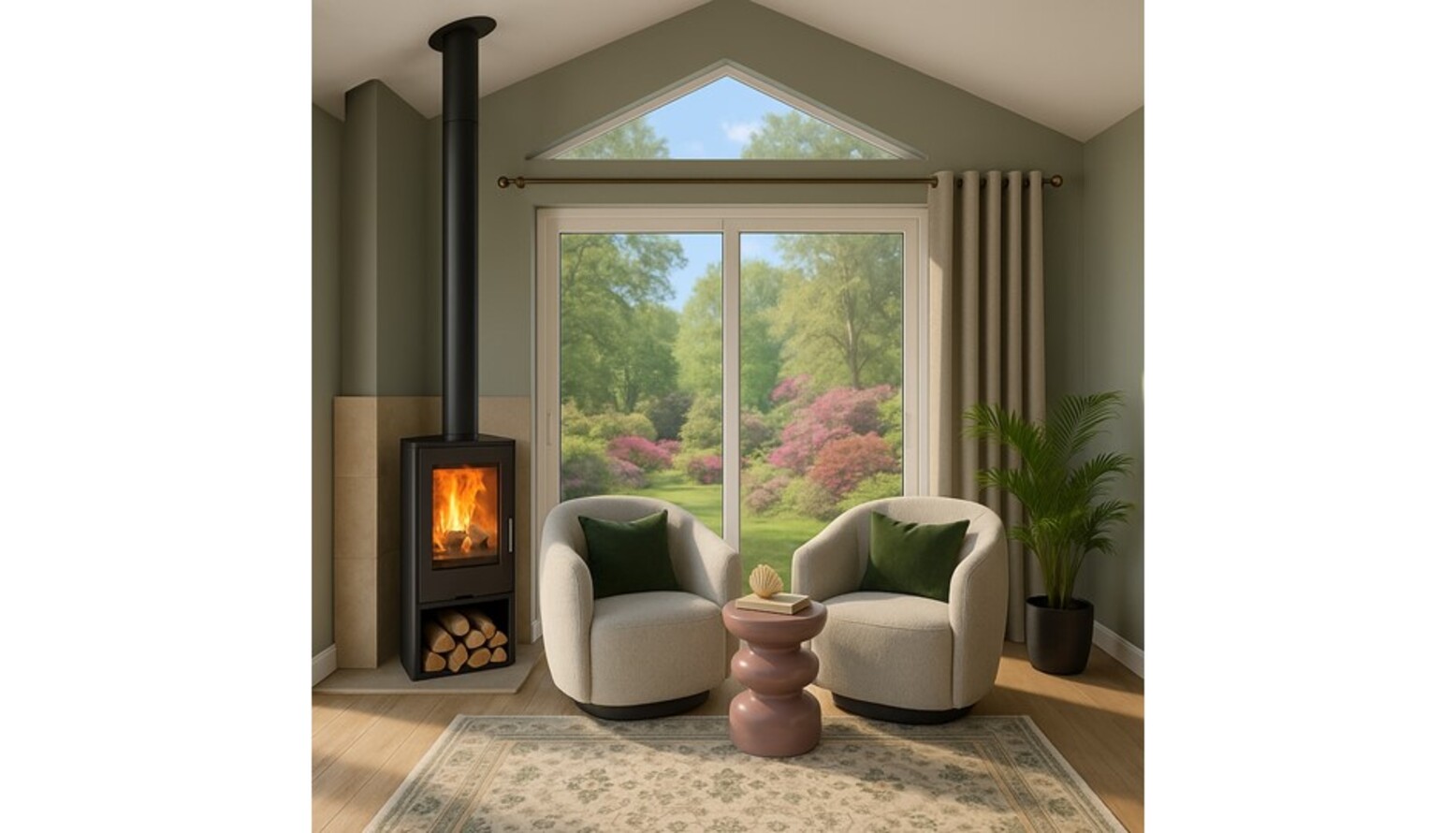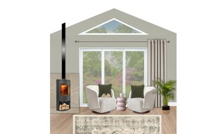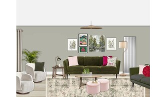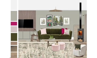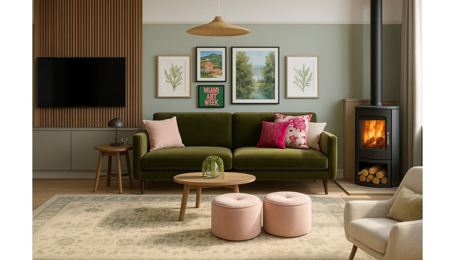 This living room features a harmonious combination of colors and textures, creating a warm and inviting atmosphere. The focal point is a plush, three-seat sofa upholstered in a rich meadow green velvet, adorned with accent cushions in shades of blush and vibrant pink. Opposite the sofa, a sleek accent chair in ivory boucle adds a contemporary touch, complementing the overall color palette. A round wooden coffee table serves as a practical centerpiece, while two soft pink pouffes provide additional seating or a footrest. Behind the sofa, the wall showcases a striking arrangement of artwork, including botanical prints and a vibrant piece that adds a splash of color. The walls are painted in a soft green hue, enhancing the natural theme. For ambient lighting, a brushed aged brass floor lamp stands gracefully beside the couch, while a natural fiber ceiling lamp casts a warm glow overhead. An intricately designed rug in muted tones anchors the space, leading the eye to a charming corner stove that adds both functionality and coziness. Modern wall-mounted shelving offers stylish storage solutions and displays, and a round mirror reflects light and creates a sense of depth. Finally, lush greenery is introduced with an extra-large Areca palm plant in a decorative basket, bringing life into the room.