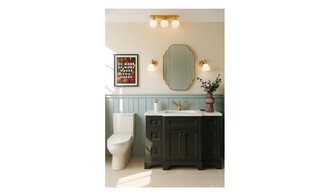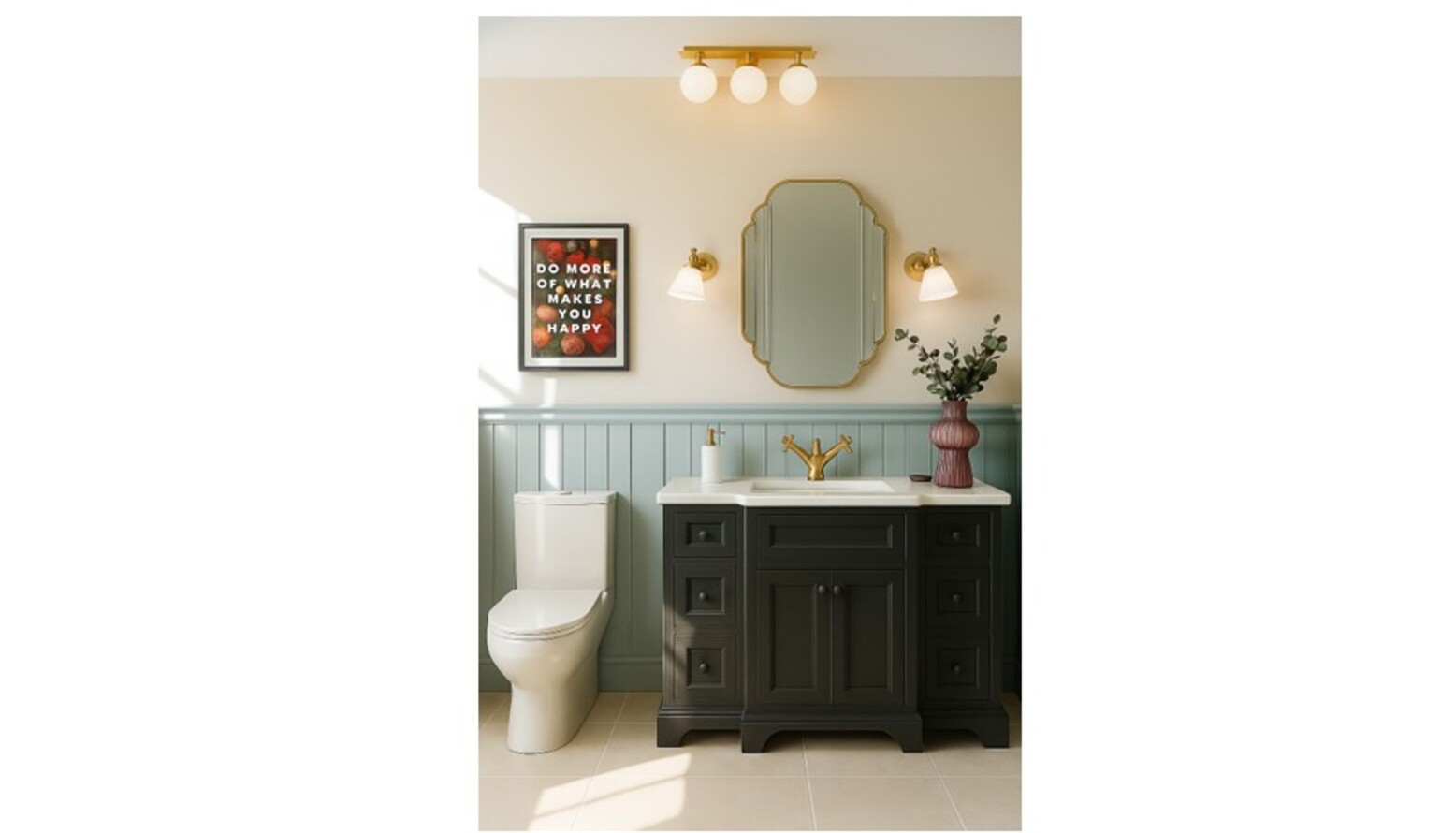 This ensuite bathroom combines elegance and functionality with a sophisticated color palette. The focal point is a dark cabinetry unit featuring detailed paneling and a white marble countertop, which brings a touch of luxury. The basin is highlighted by a brushed brass Caledonia cross mixer tap, contrasting beautifully with the dark cabinetry. To the side, a modern rimless toilet maintains the aesthetic. Above the sink, a stylish mirror with an ornate frame rests between two soft cone-shaped sconces, enhancing the ambient lighting. A framed motivational quote artwork adds a personal touch, bringing warmth and character to the space. The walls showcase a soothing pale hue, complemented by a wainscoting in a muted blue color, adding depth and texture. Natural light floods in, illuminating the light-colored floor tiles that provide a clean and spacious feel. The overhead light fixture with opal glass shades and sleek brass detailing further ties the room together. A decorative vase with greenery adds a hint of freshness to the countertop, while a ladder towel rail in anthracite provides both function and a modern touch. The overall design harmonizes practicality and style, creating a peaceful retreat in the home.