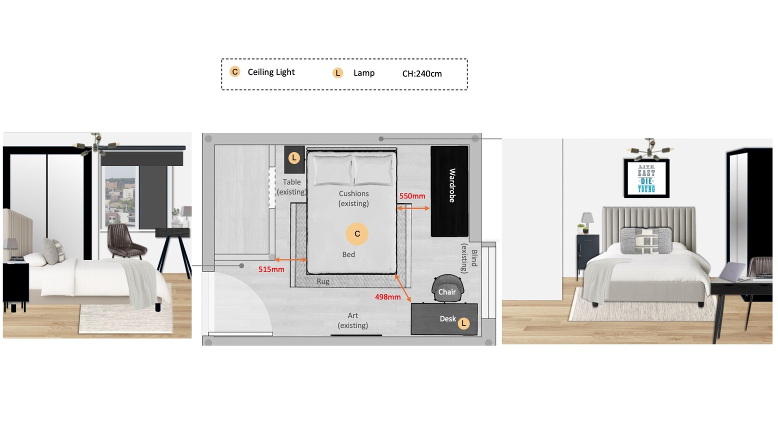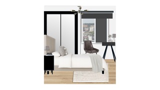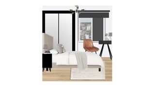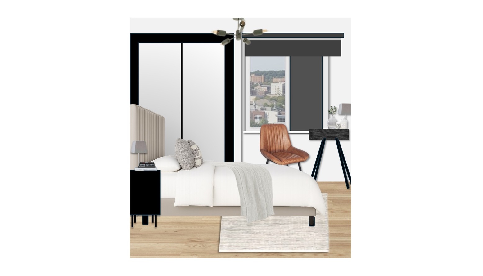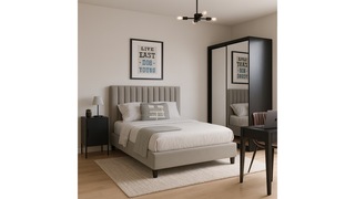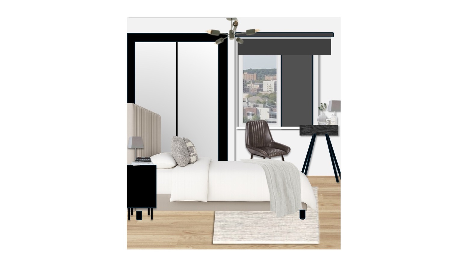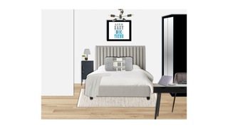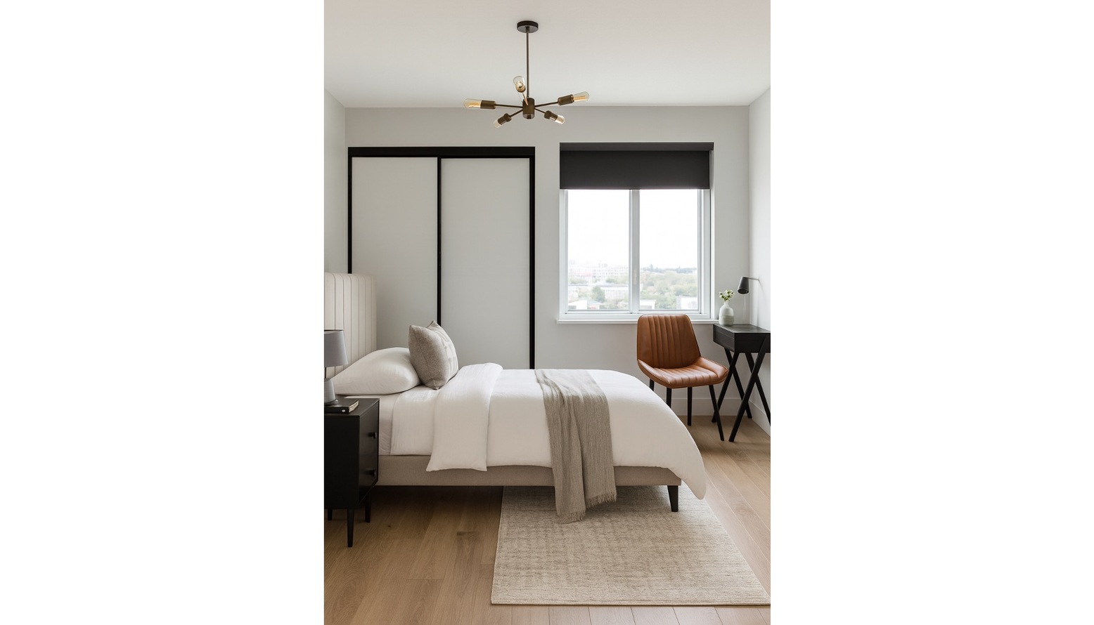 The room also includes a black desk table lamp, ensuring ample task lighting for work or study. A full-length mirror adjacent to the bed not only enhances the space but also reflects light, creating an airy feel. The overall aesthetic is clean and modern, with neutral tones punctuated by the rich textures of the upholstery and the contrasting black furniture pieces.