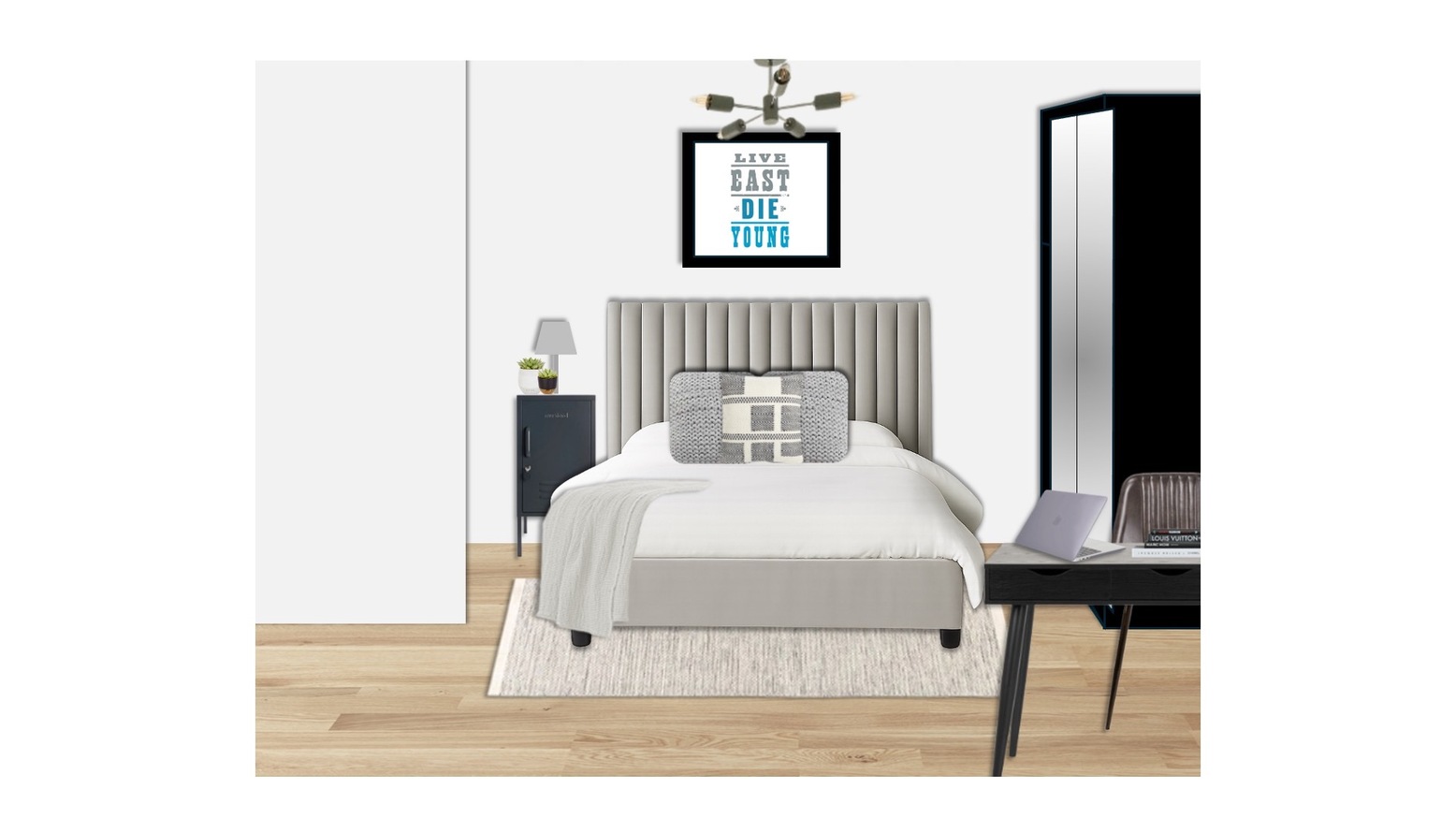 A framed motivational print hangs above the bed, adding character and a personalized touch to the space. Opposite the bed, a three-drawer office desk in black is paired with an Angelo Peppercorn leather and bronze metal dining chair, blending functionality with a retro charm.