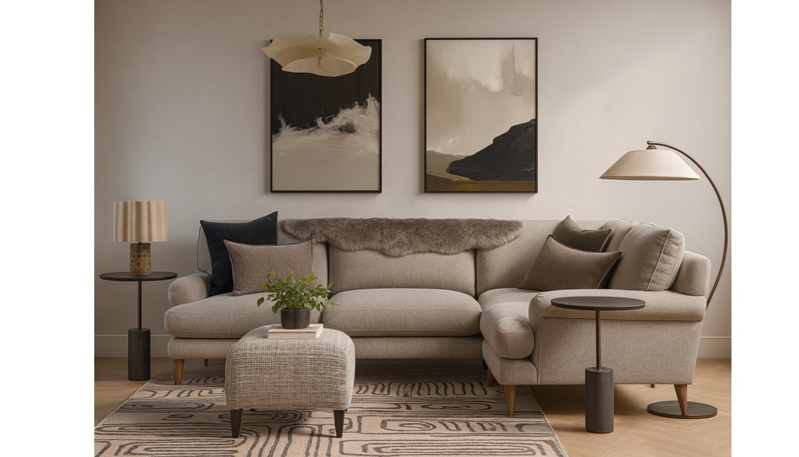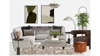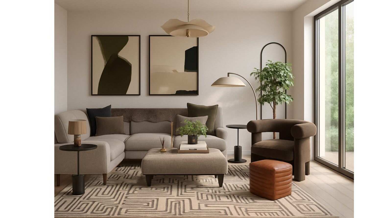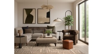 The earthy tones of the space are enhanced by a striking Kassena flatwoven rug, which grounds the seating arrangement. Above, a layered textured glass chandelier provides captivating overhead illumination, while a modern floor lamp offers adjustable lighting for various moods.