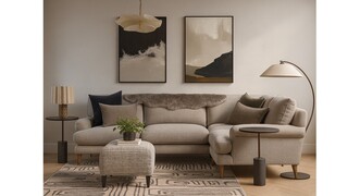 The seating area features a cozy sectional sofa adorned with plush velvet cushions, inviting comfort. A stylish accent chair with rounded edges and rich brown upholstery complements the sofa, offering additional seating while maintaining a contemporary aesthetic.