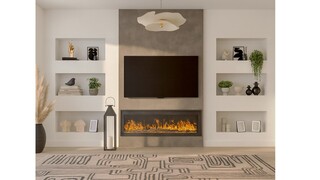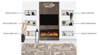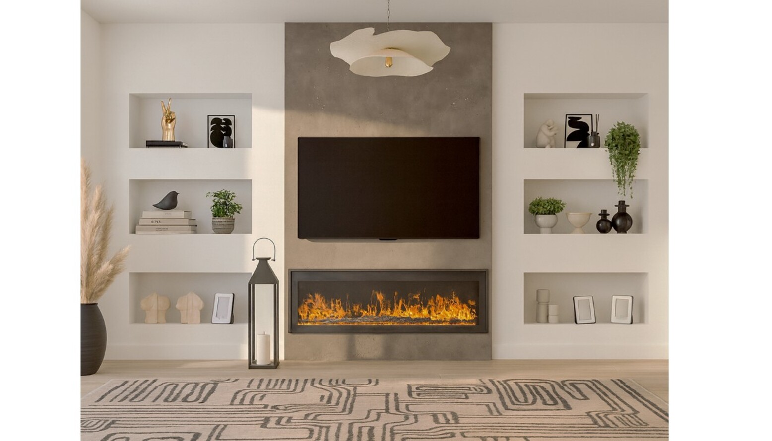Artistic touches abound with abstract wall art that adds visual interest. A combination of greenery, both real and faux, introduces a touch of nature—highlighted by a stylish planter that seamlessly integrates with the decor.