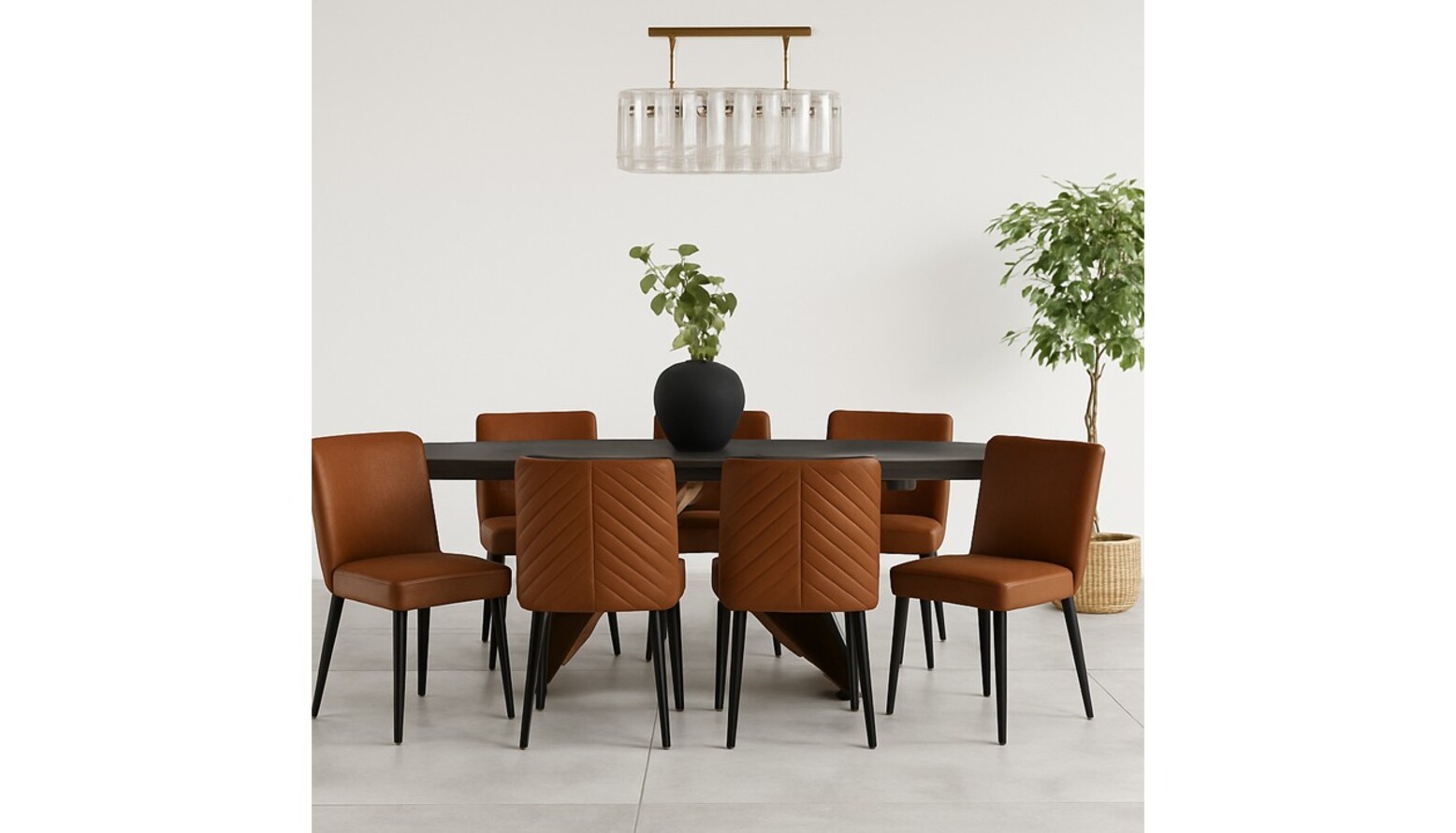 This dual-function room beautifully merges living and dining spaces, creating a harmonious environment for relaxation and entertaining. The focal point is an elegant extending dining table crafted from dark grey ceramic, accommodating up to ten guests, perfect for lively dinner parties.