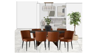Functional elements include a chic side table and a striking black marble top beside table, providing a perfect spot for drinks. The overall ambiance balances sophistication with warmth, making this room an inviting haven for both dining and leisure.