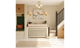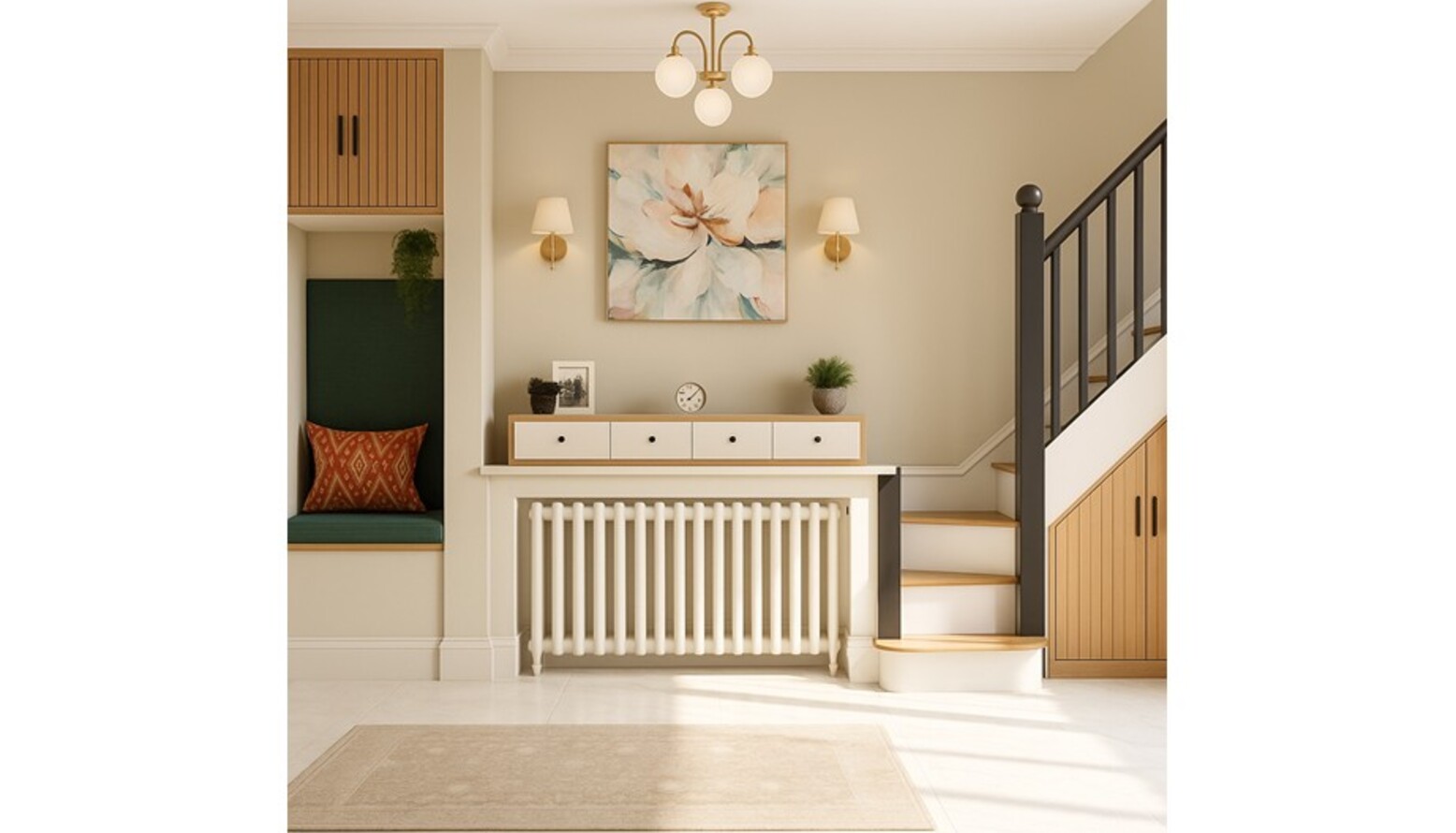 A sleek console table spans the wall beneath the artwork, adorned with a few carefully selected decorative items including a wall clock and a small plant in a decorative pot. Below the console, a vintage-style radiator adds character while ensuring warmth.