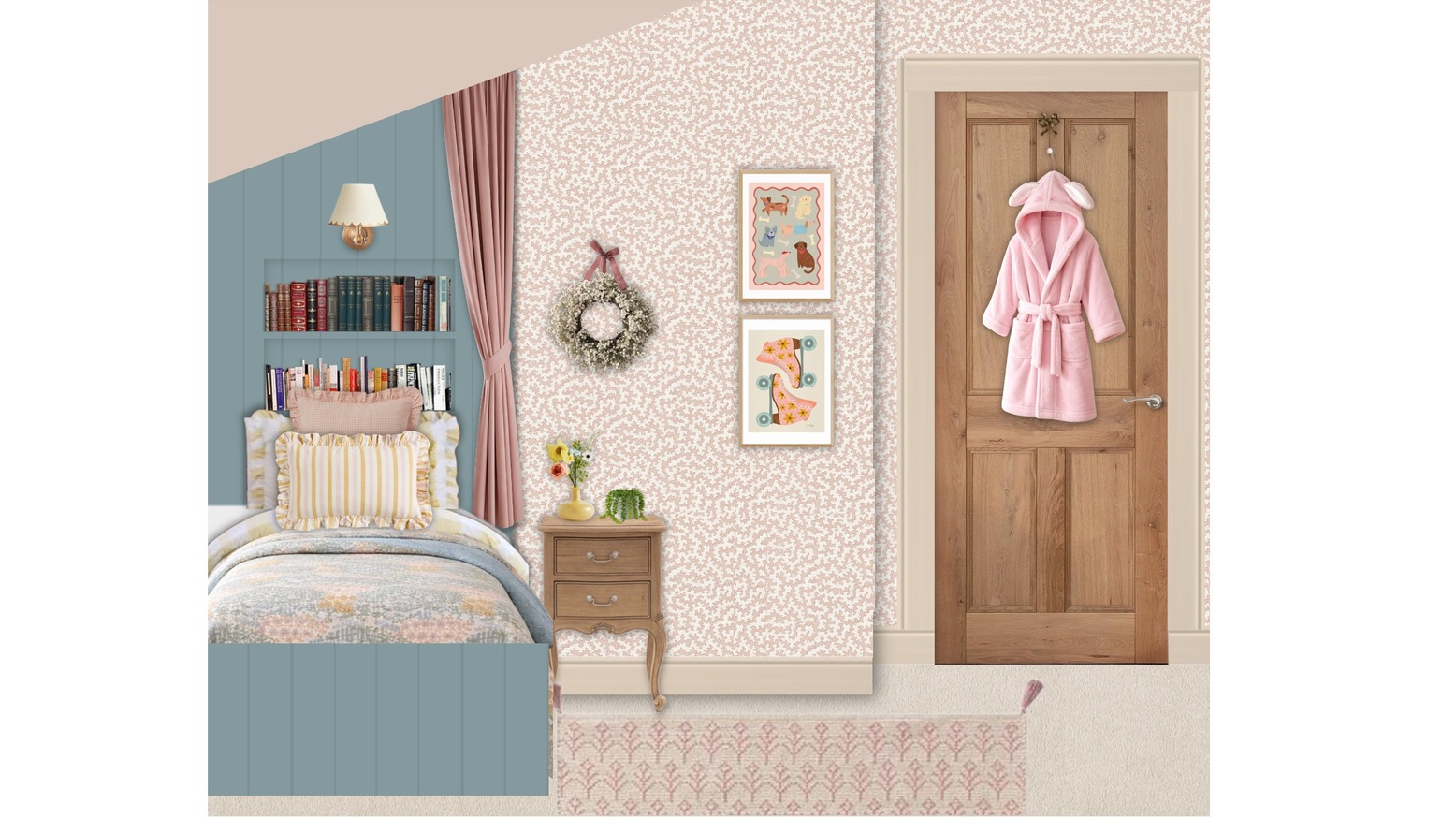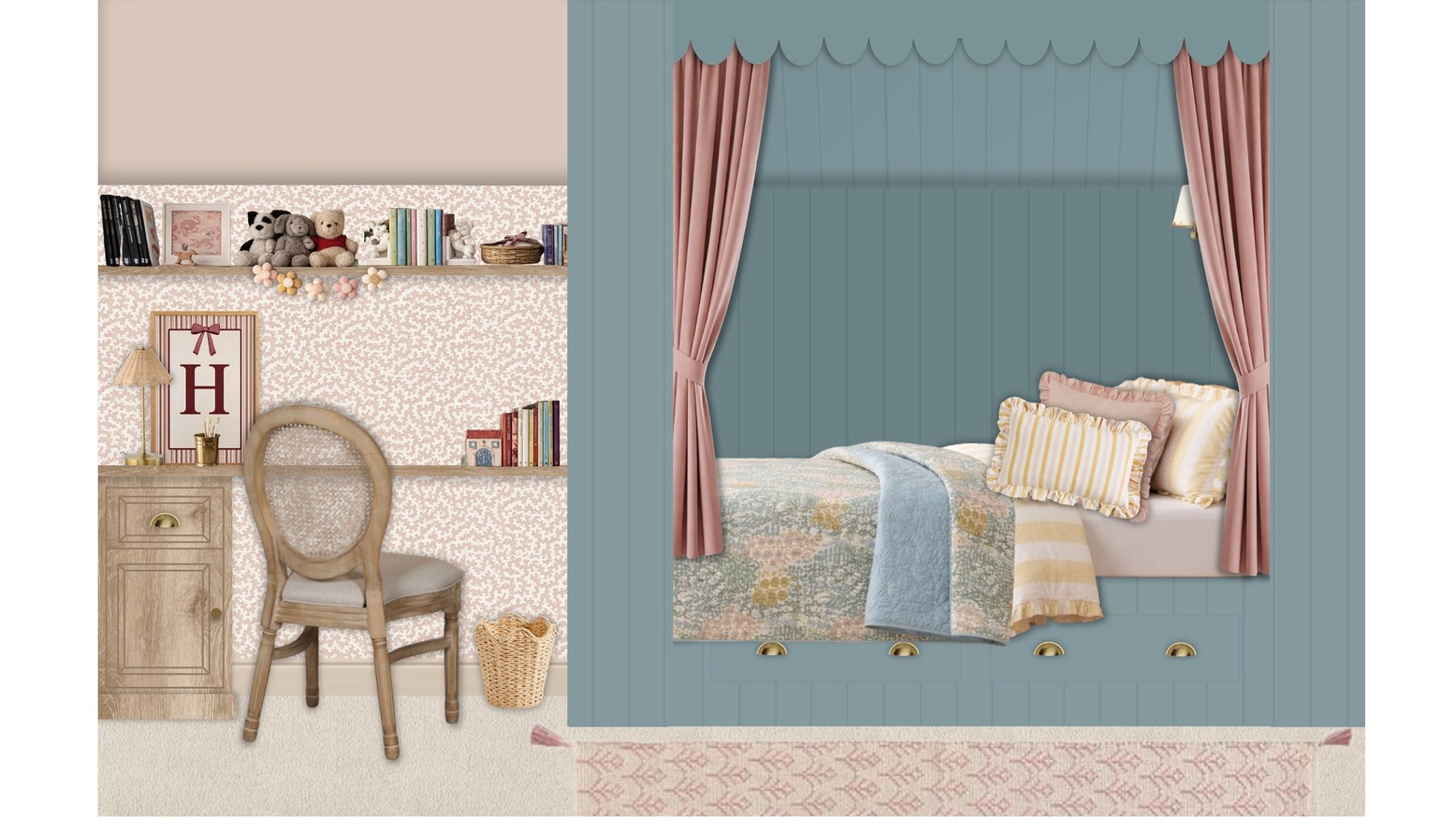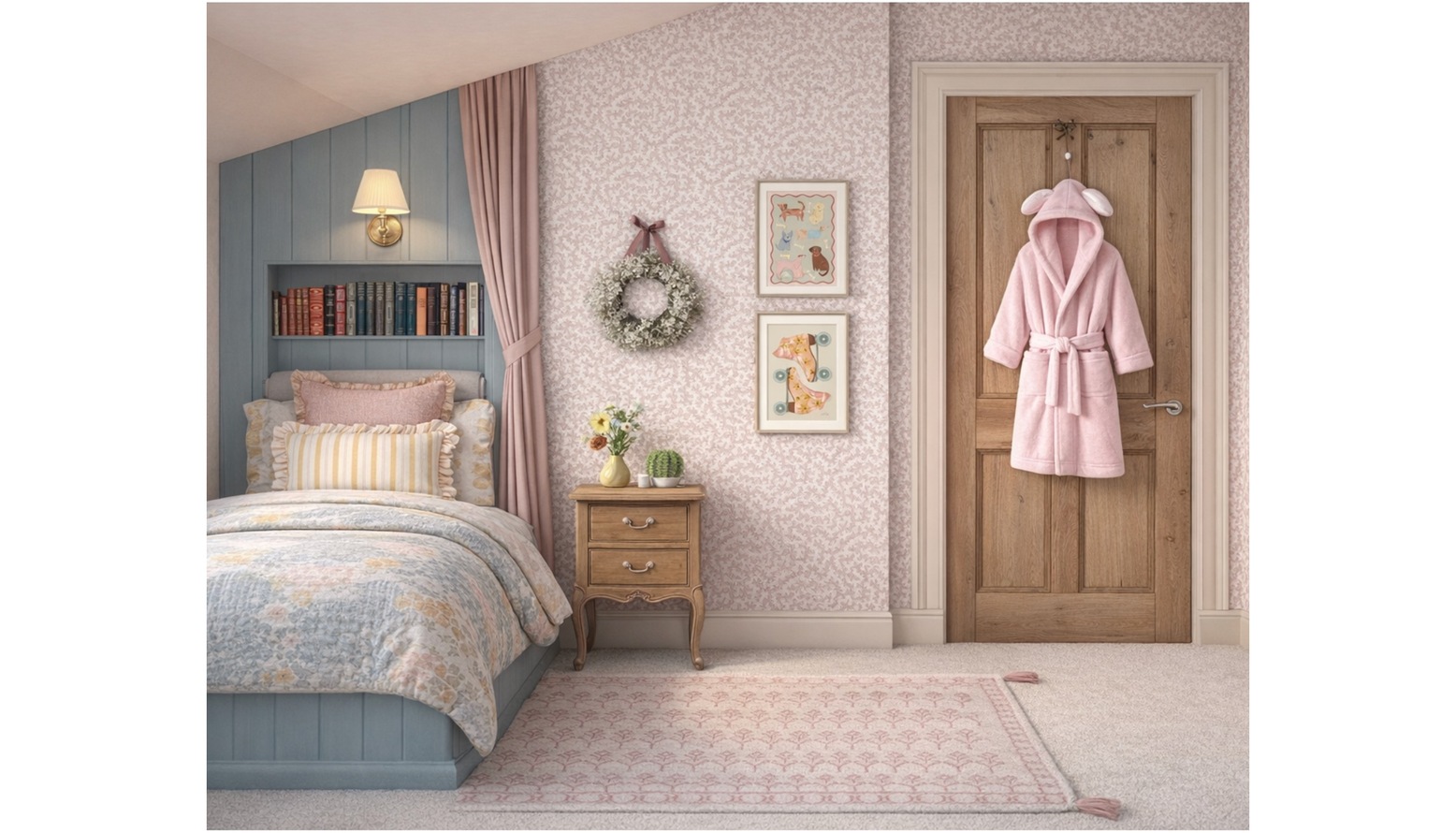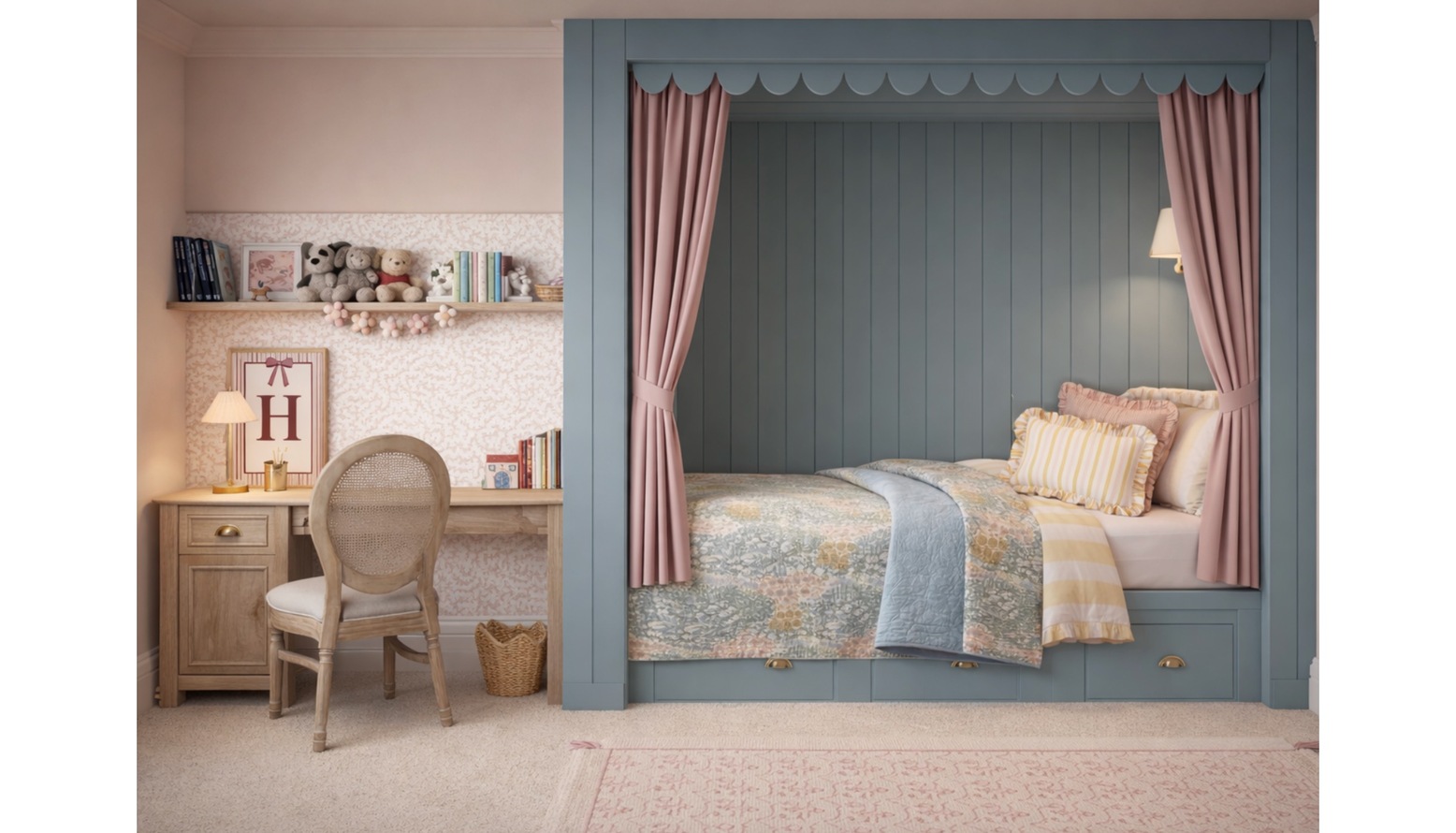 This children's bedroom features a cozy, charming design with soft pastel tones and elegant furniture pieces. The walls are painted in a light, neutral color, complemented by a beautiful floral patterned wallpaper that adds a touch of whimsy.