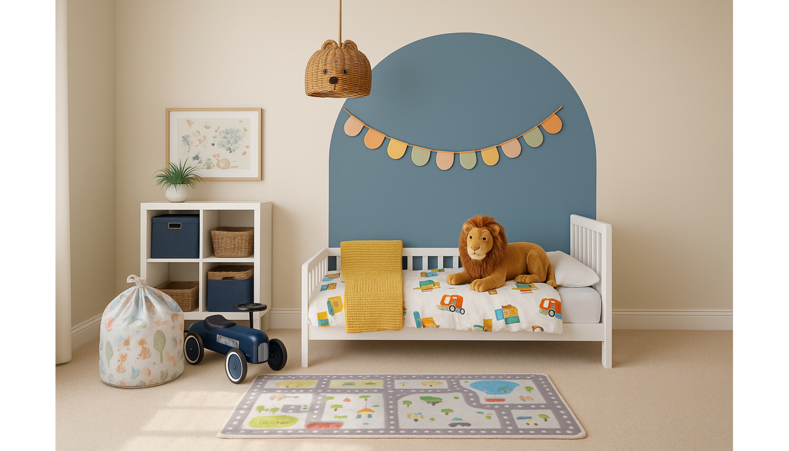 The walls are adorned with a soft beige color, creating a warm base that complements the cheerful blue feature wall behind the bed. This feature wall is semi-circular in shape, topped with a whimsical bunting arrangement in soft pastel hues, adding a fun touch to the space.