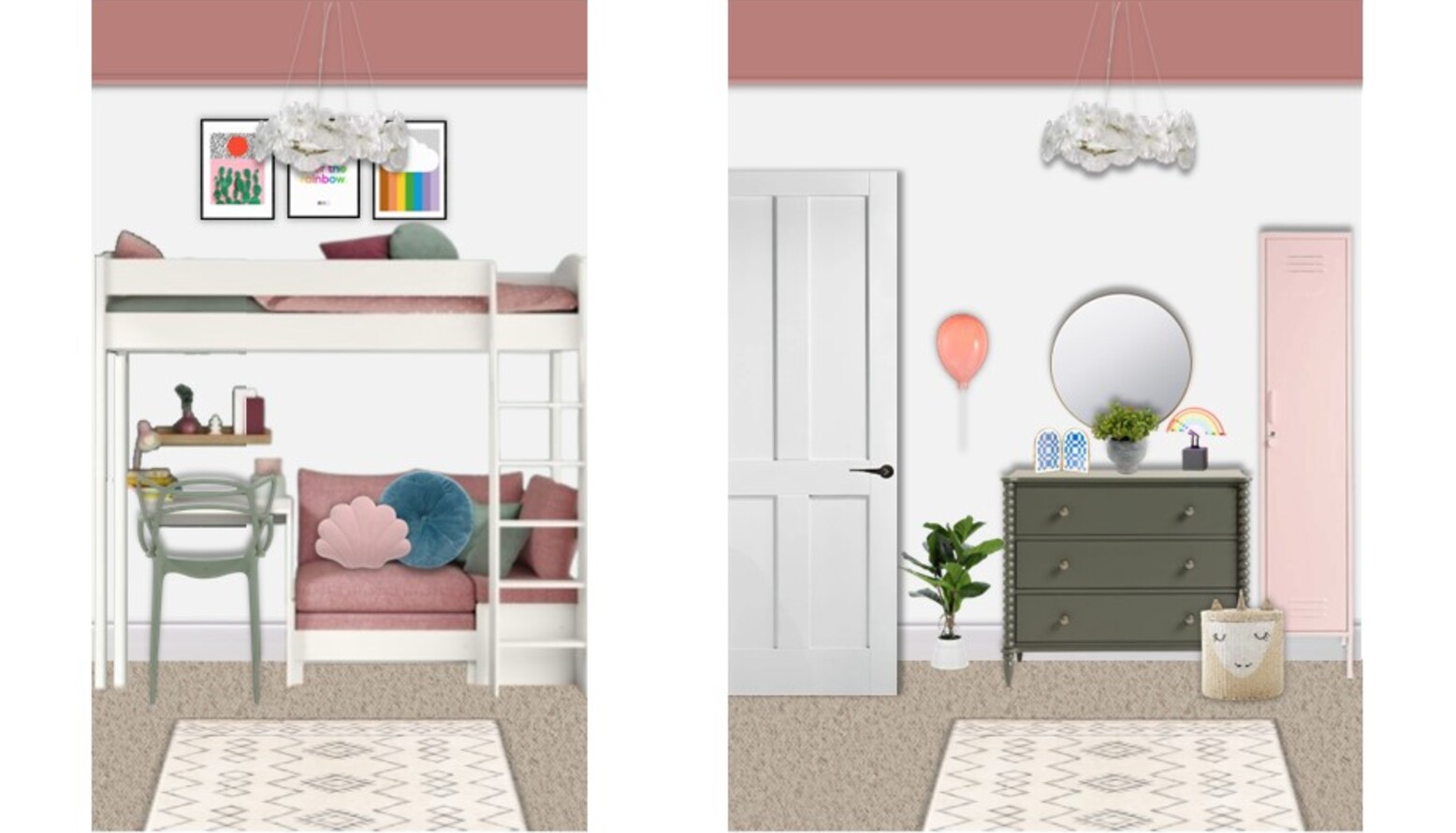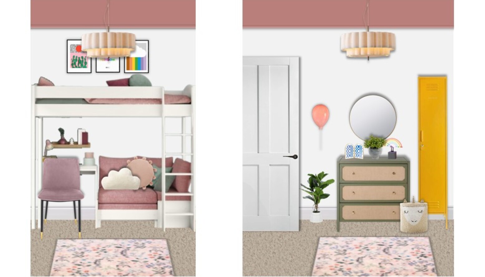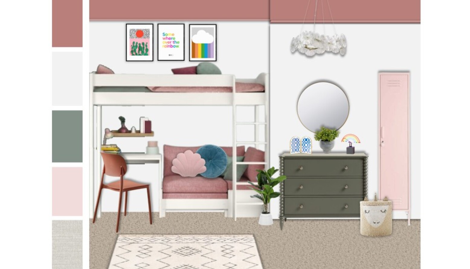 This vibrant children's bedroom is designed to be both stylish and fun, perfect for a growing child's needs. The main feature is a sleek mid-sleeper bed in white that offers space-saving functionality along with a cozy, pink and teal color scheme.
