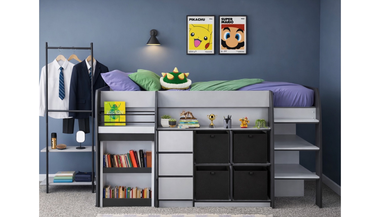 This vibrant children's bedroom features a stylish midsleeper bed that maximizes space and adds character. The walls are painted in a soothing shade of blue, providing a calming backdrop for playful accents. A sleek black wall-mounted shelving unit effortlessly integrates storage and display, hosting an array of colorful books and toys.