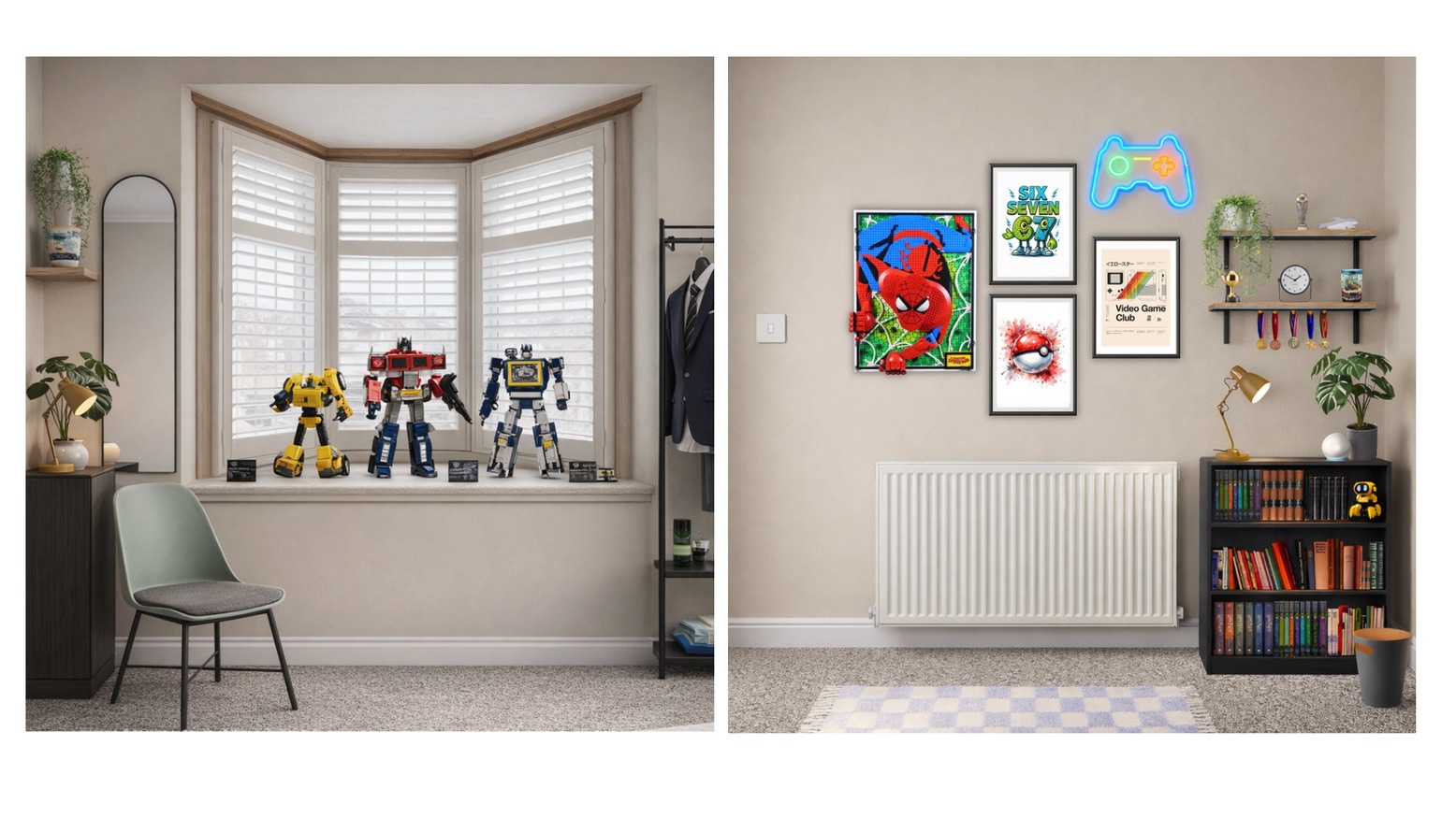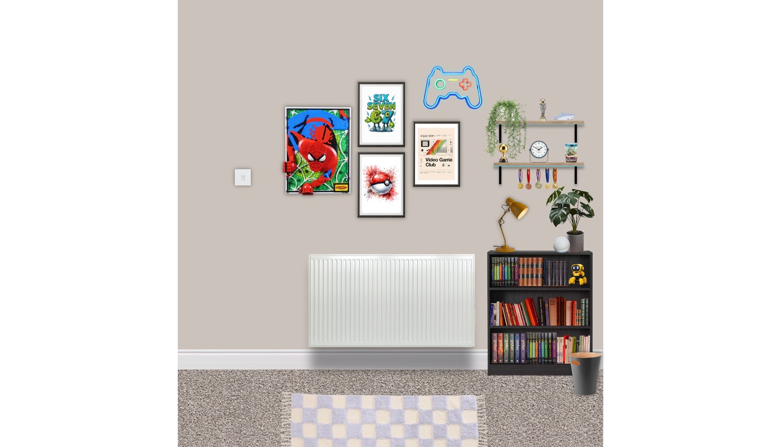 A striking game controller neon sign catches the eye, adding a playful touch, alongside cheerful artwork featuring beloved characters. Soft, pastel bedding brings comfort, inviting restful sleep, while thoughtful lighting options, including a stylish lamp and dimmable wall light, offer ambient illumination for reading or playtime.