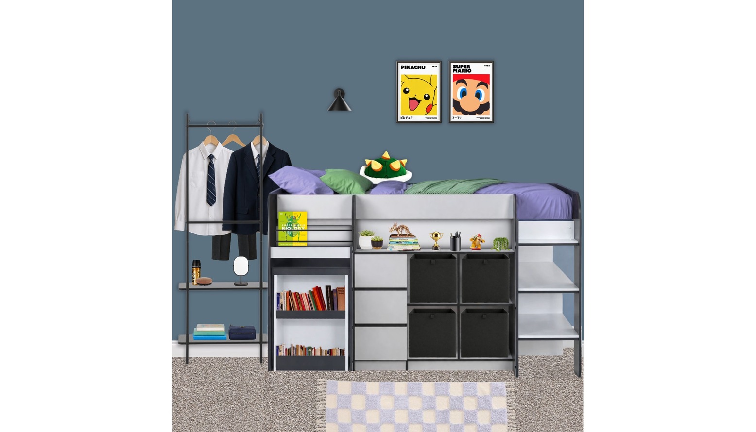 The bed is complemented by a modern black clothes rail, perfect for organizing outfits while maintaining an open feel. A cozy rug in purples introduces warmth, while foldable storage boxes add a splash of fun and function.