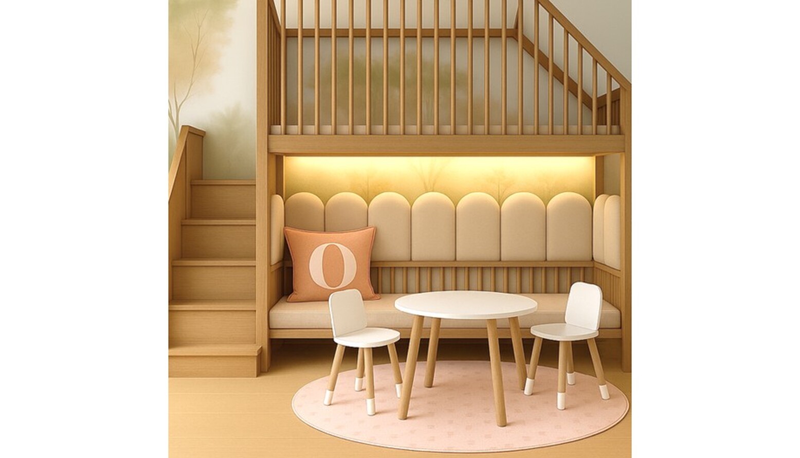 Beneath the elevated play area, a snug reading nook is created, framed by soft upholstery and illuminated by gentle lighting, fostering a welcoming space for relaxation and creativity. A compact, yet functional table and chair set in white and natural wood offers a perfect spot for art and play.