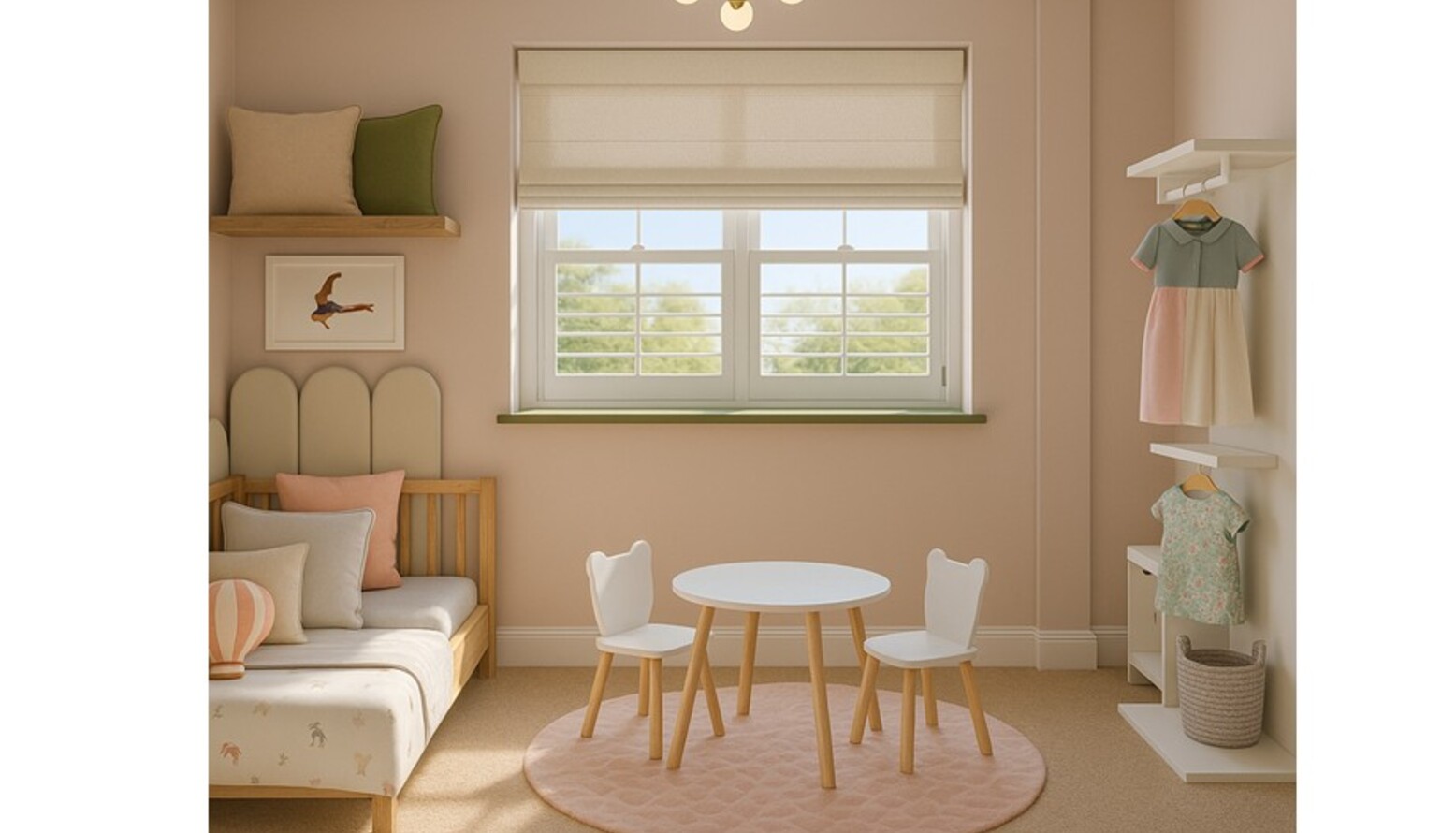 When it comes to utilising space, shelves are your friend! Try and keep as much open floor space as possible as that will make the room feel spacious and also allows space for your little ones to play.