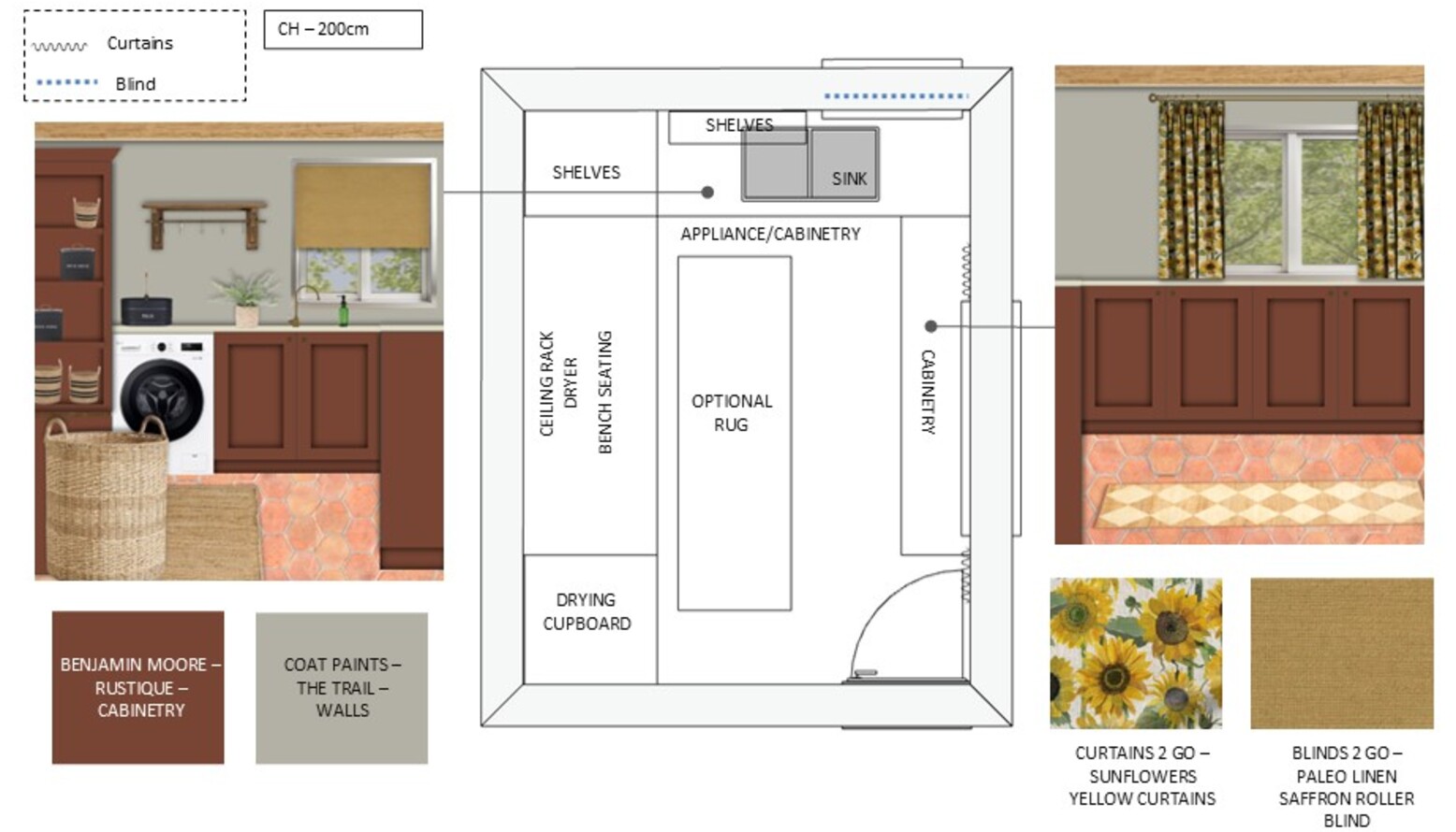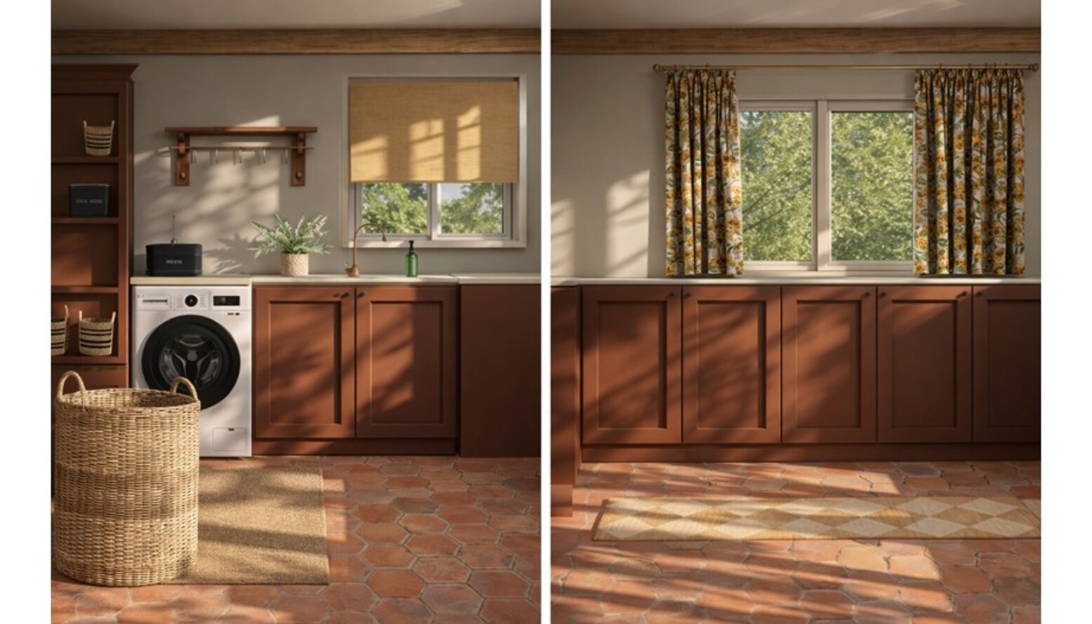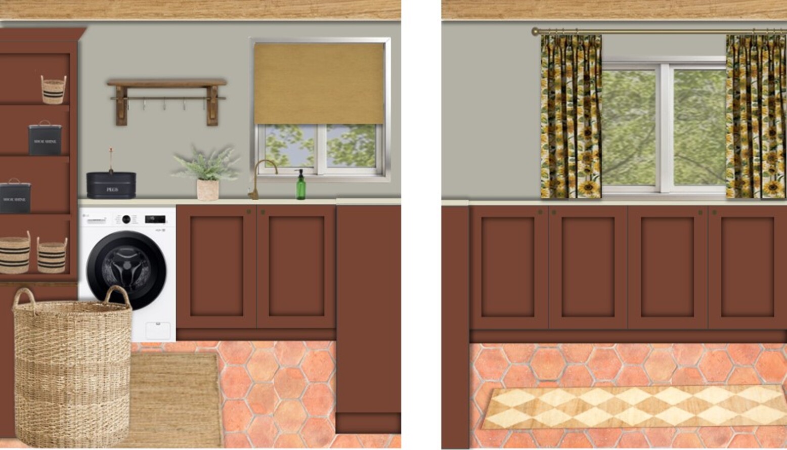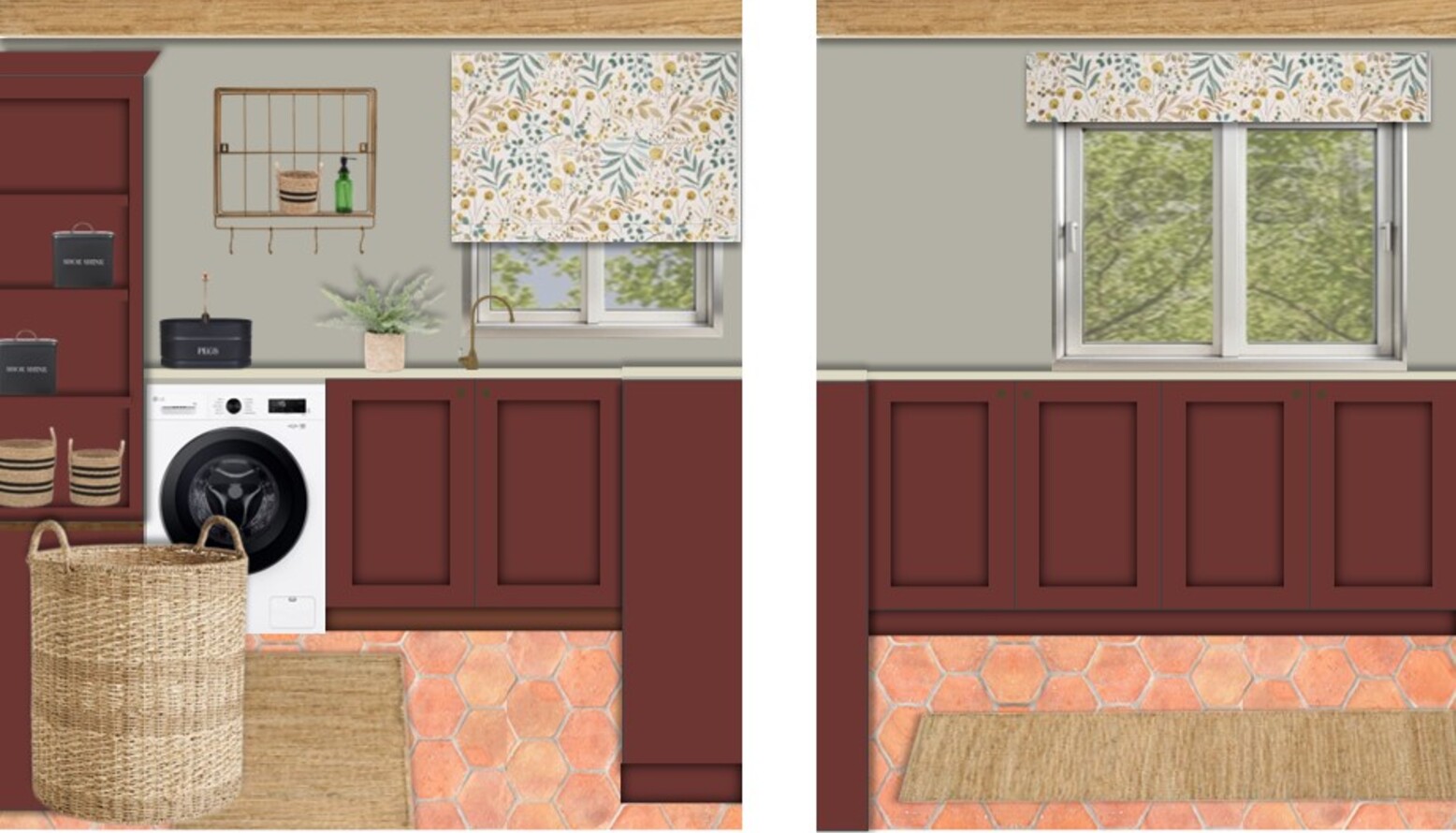 This kitchen is infused with a blend of functionality and style. The warm, earthy tones of the cabinetry complement the terracotta flooring, creating a welcoming atmosphere. A floating wood shelf serves as a chic display for decorative items or cookbooks. A woven seagrass round laundry basket adds texture and a natural element, while a stylish Soumak runner adds warmth underfoot. Natural light filters in through the window, adorned with patterned curtains, enhancing the inviting ambiance of the space. The overall design is both practical and aesthetically pleasing, making it a perfect hub for both cooking and socializing.