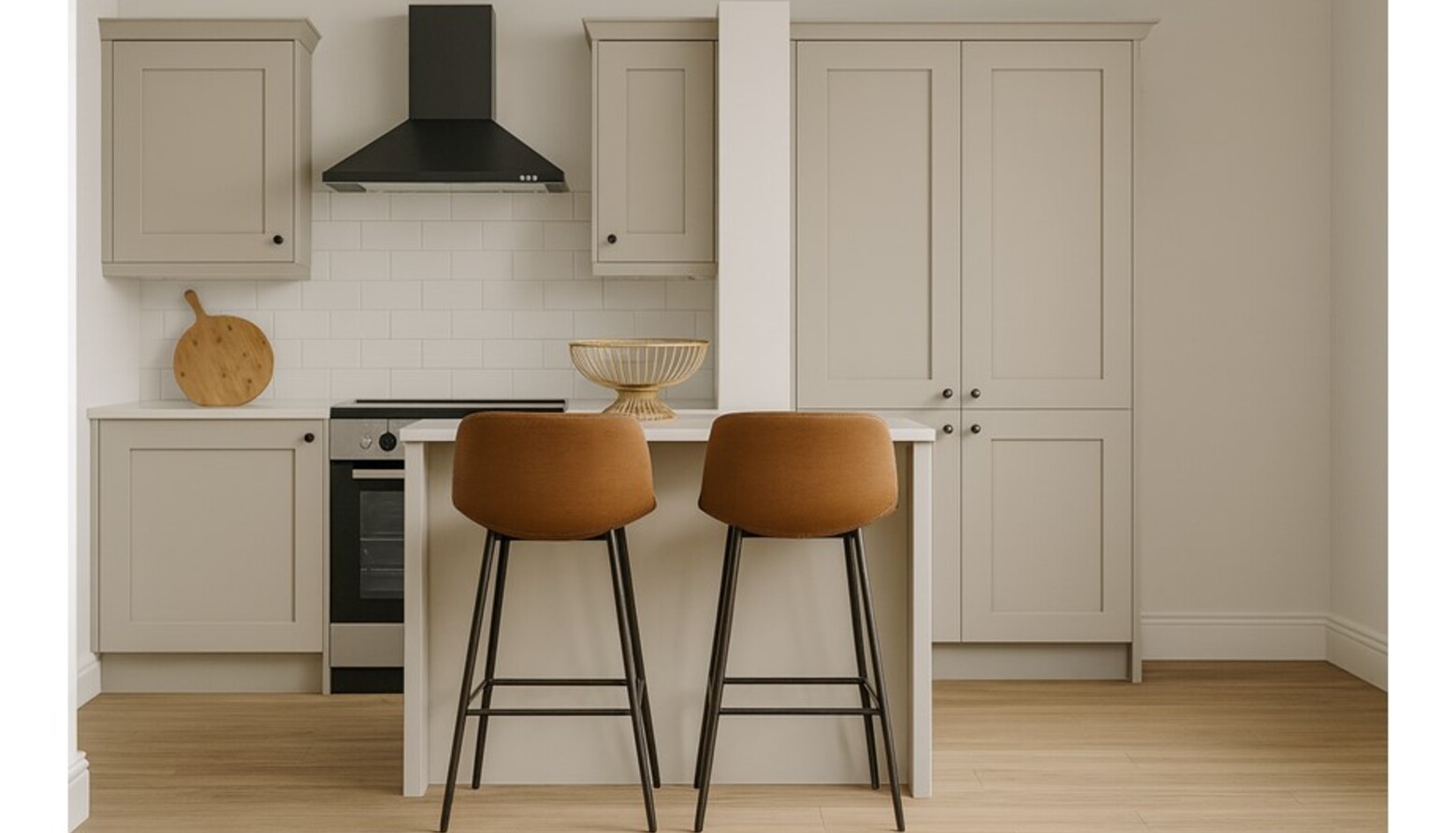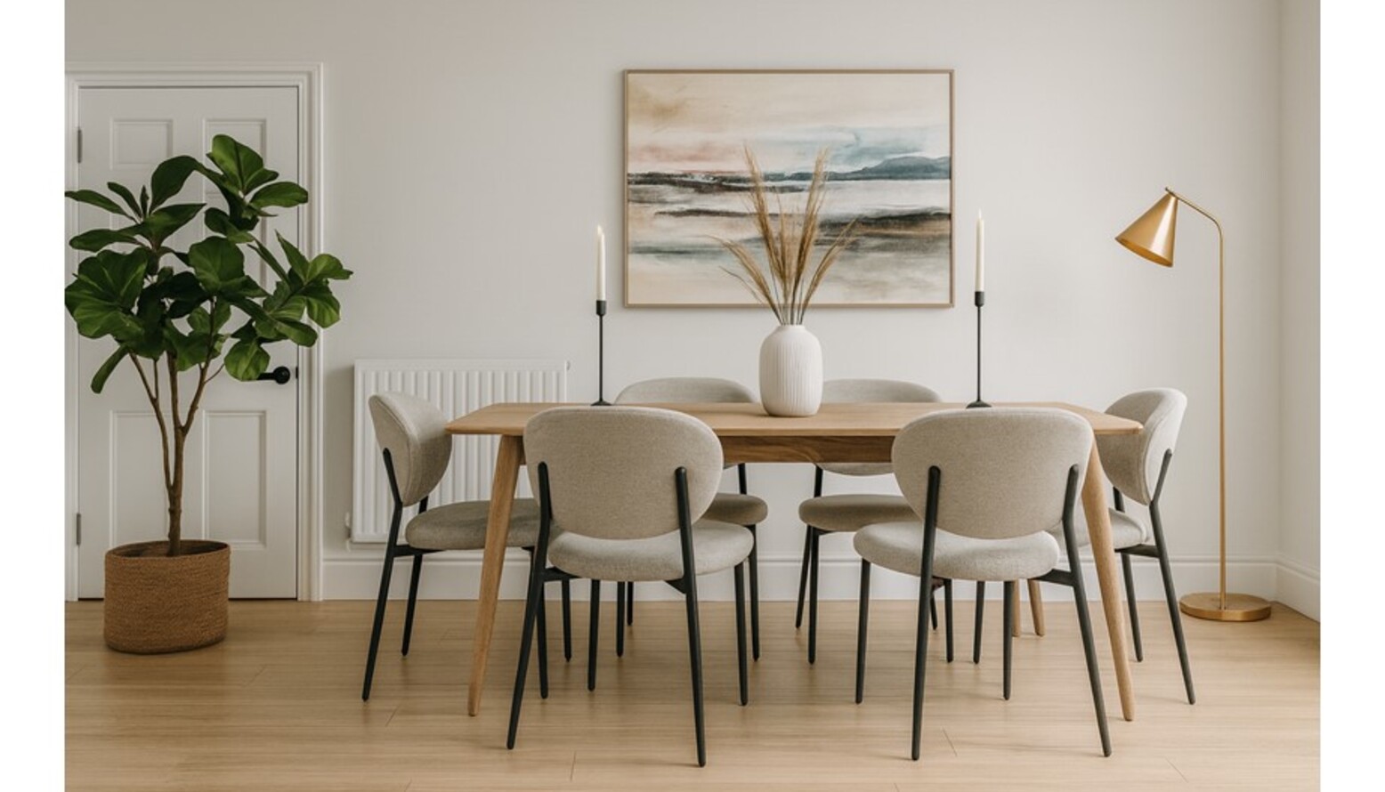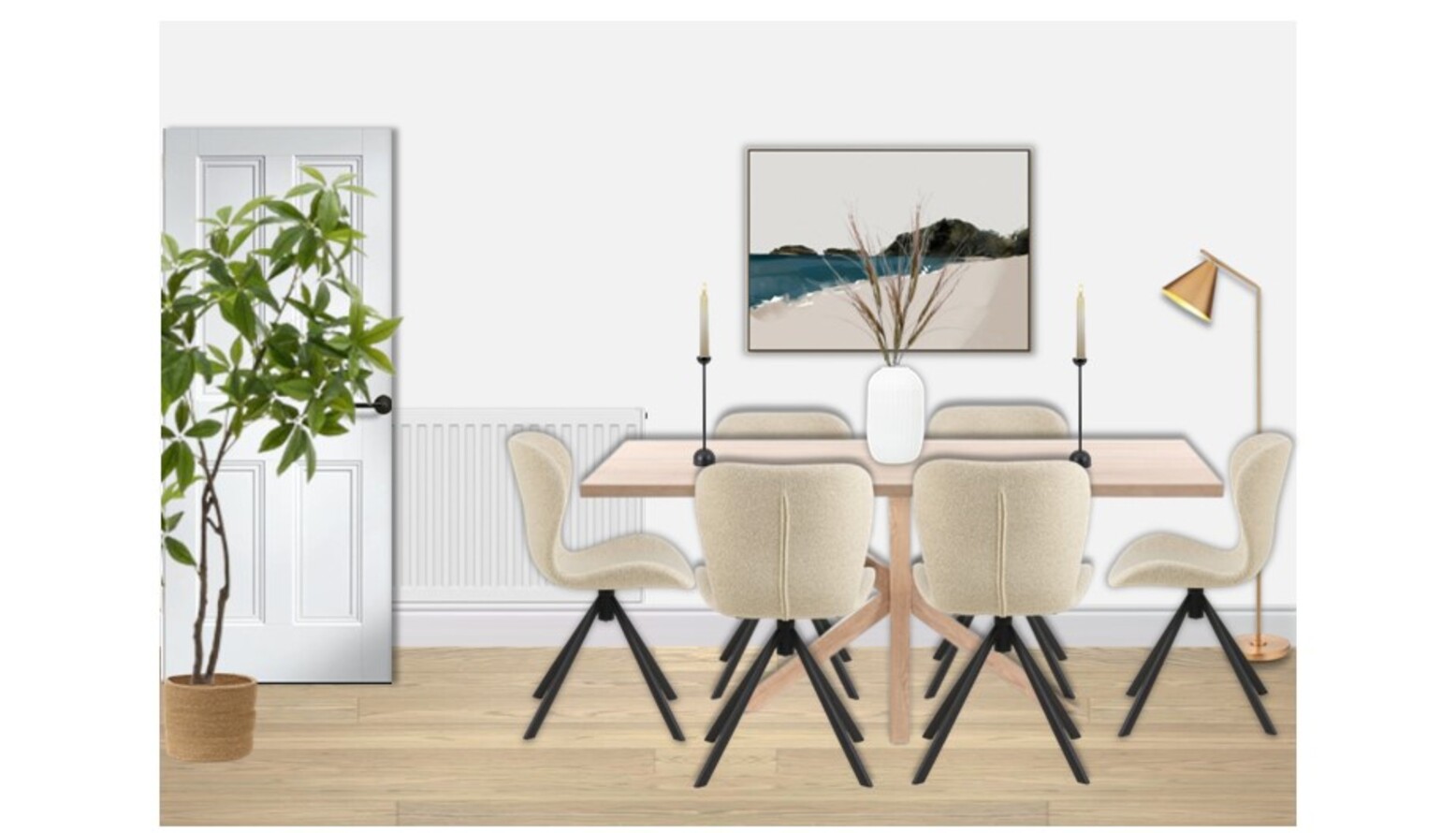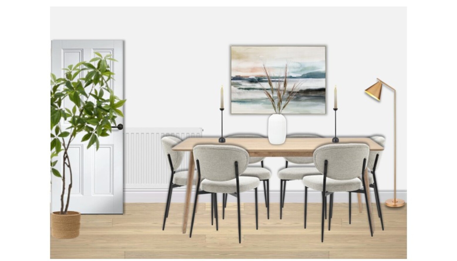 The kitchen and dining area features a warm and inviting atmosphere, highlighted by a panelled dining table set against a backdrop of soft, neutral walls. This table, measuring 1800x800x750mm, seamlessly accommodates multiple guests, flanked by an array of elegant dining chairs with soft upholstery that promise comfort during meals. A striking artwork hangs above the table, showcasing soft hues that complement the overall color palette. The presence of slender candlesticks on the table adds a touch of sophistication and ambiance to the space. In one corner, a tall faux Pachira tree in a simple black pot introduces an organic element, bringing life to the room without the maintenance of real plants. A stylish floor lamp in antique brass stands nearby, providing additional illumination and enhancing the modern aesthetic. The room's design is further accentuated by an opal glass pendant ceiling light, which adds an air of elegance. With its natural light wood tones and soft textiles, this kitchen and dining room is both functional and aesthetically pleasing, creating a perfect setting for daily meals or entertaining guests.