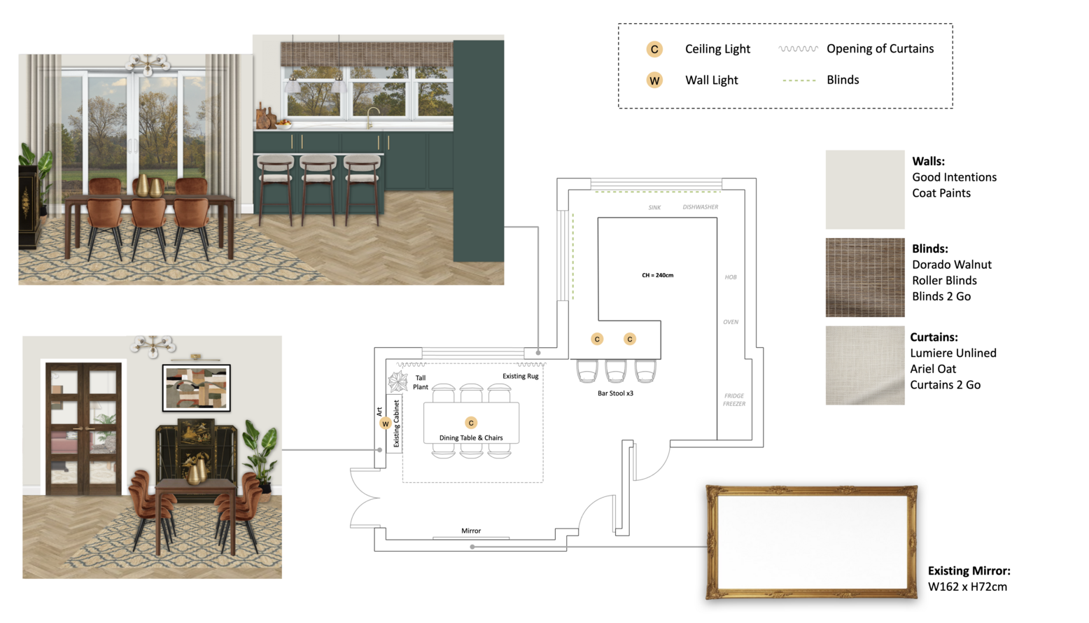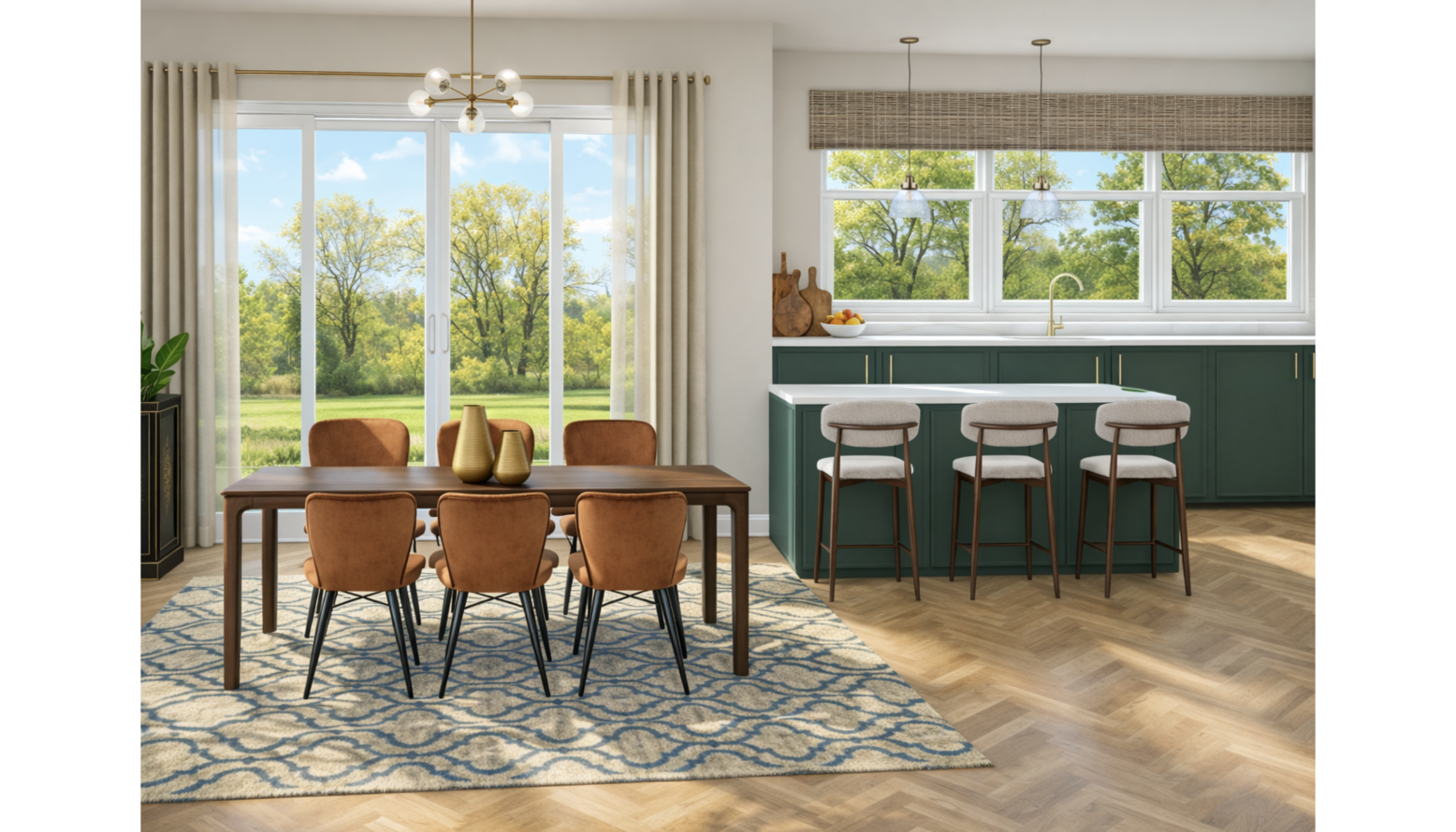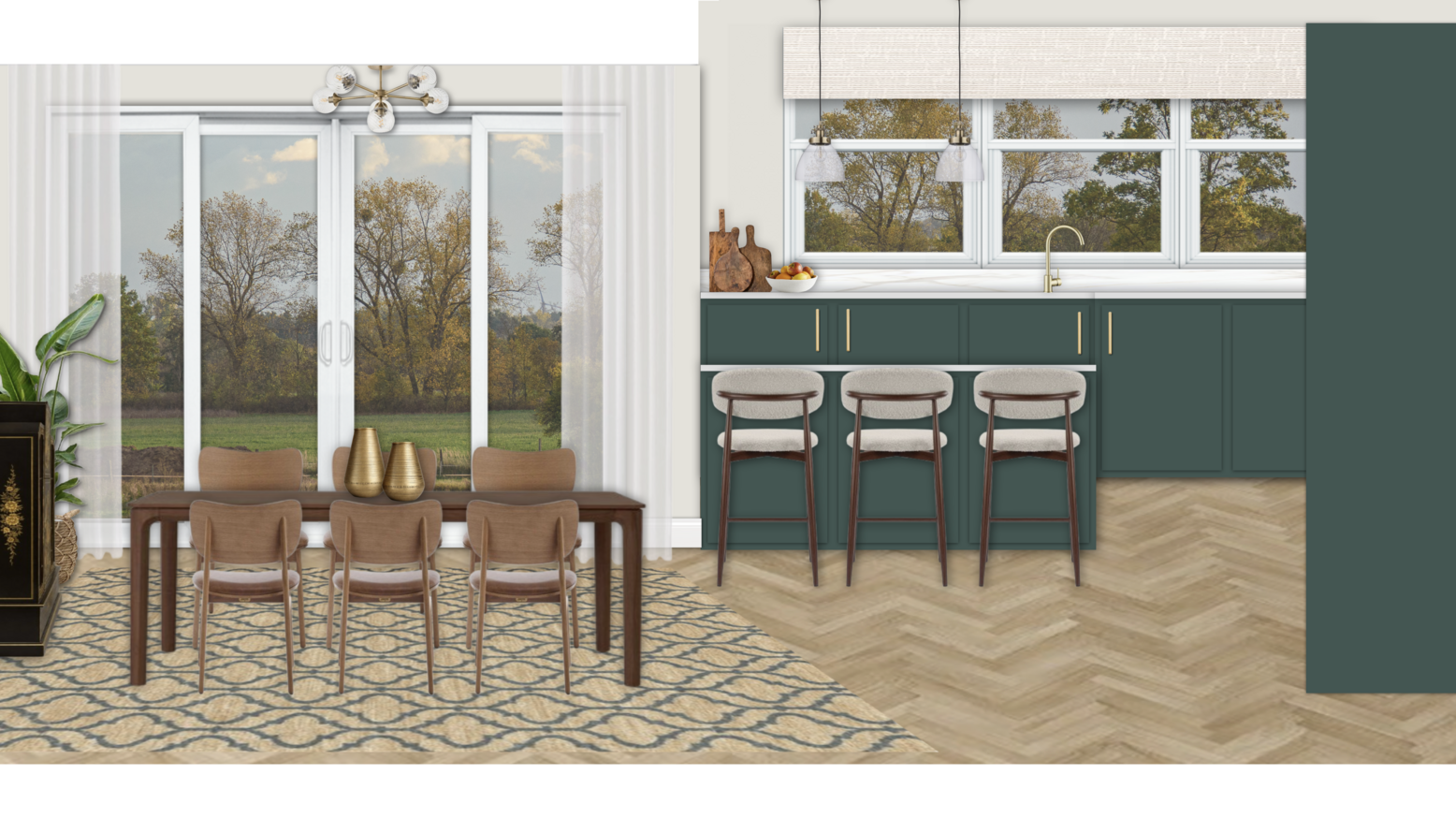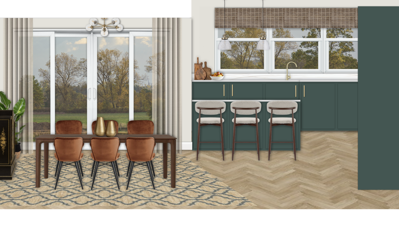This inviting kitchen/dining room beautifully combines contemporary and functional design elements. The space features a rich walnut dining table that extends, surrounded by stylish dining chairs in a warm copper hue, adding a touch of elegance. Adjacent to the dining area, sleek bar stools with a cream fabric finish provide comfortable seating at a stylish kitchen island, which harmonizes with deep green cabinetry. Natural light floods the room through large windows, framed by soft, neutral curtains that enhance the airy feel. A woven window treatment provides an artful contrast, blending seamlessly with the rustic outdoor views. Lighting is thoughtfully curated, featuring an antique brass ceiling light that casts a warm glow over the dining space, while additional modern picture lights highlight wall art perfectly. A large, striking Strelitzia plant in a beautiful basket brings life and greenery into the room, completing the inviting atmosphere. The patterned area rug anchors the space, combining soft, earthy tones that link the room’s color palette while ensuring comfort underfoot.