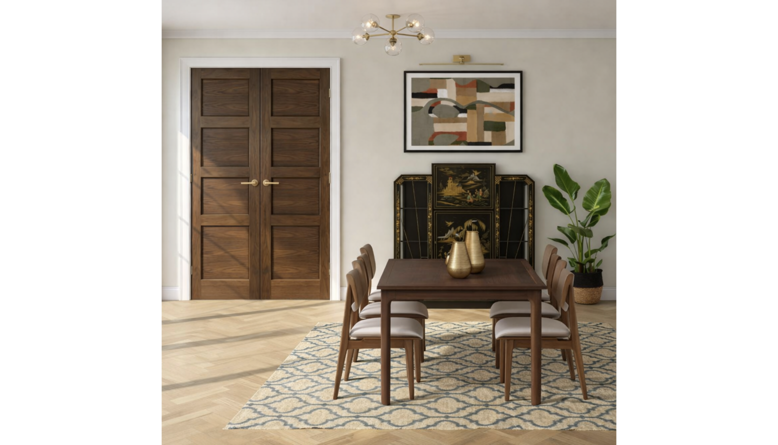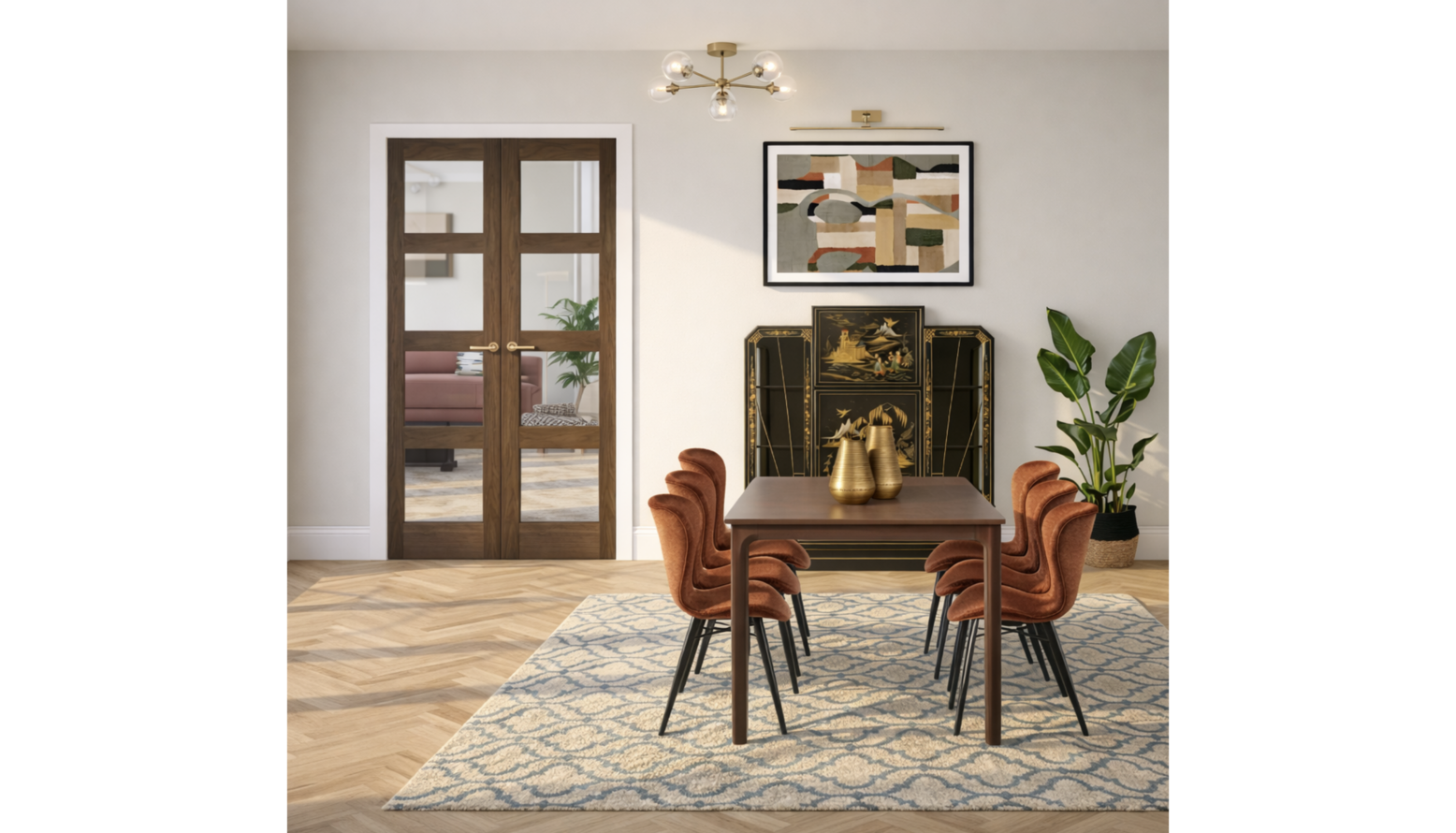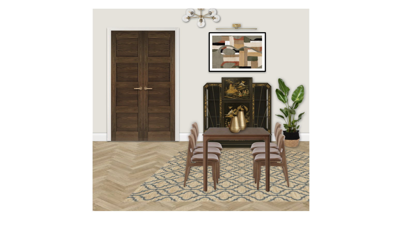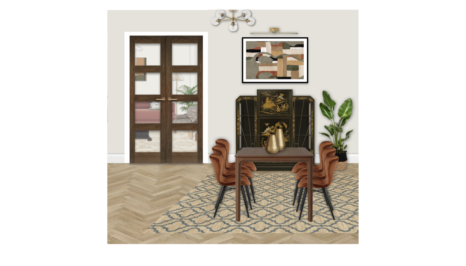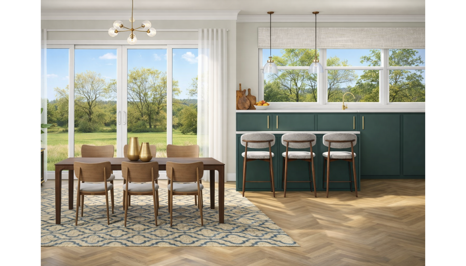 This inviting kitchen/dining room beautifully combines contemporary and functional design elements. The space features a rich walnut dining table that extends, surrounded by stylish dining chairs in a warm copper hue, adding a touch of elegance. Adjacent to the dining area, sleek bar stools with a cream fabric finish provide comfortable seating at a stylish kitchen island, which harmonizes with deep green cabinetry. Natural light floods the room through large windows, framed by soft, neutral curtains that enhance the airy feel. A woven window treatment provides an artful contrast, blending seamlessly with the rustic outdoor views. Lighting is thoughtfully curated, featuring an antique brass ceiling light that casts a warm glow over the dining space, while additional modern picture lights highlight wall art perfectly. A large, striking Strelitzia plant in a beautiful basket brings life and greenery into the room, completing the inviting atmosphere. The patterned area rug anchors the space, combining soft, earthy tones that link the room’s color palette while ensuring comfort underfoot.