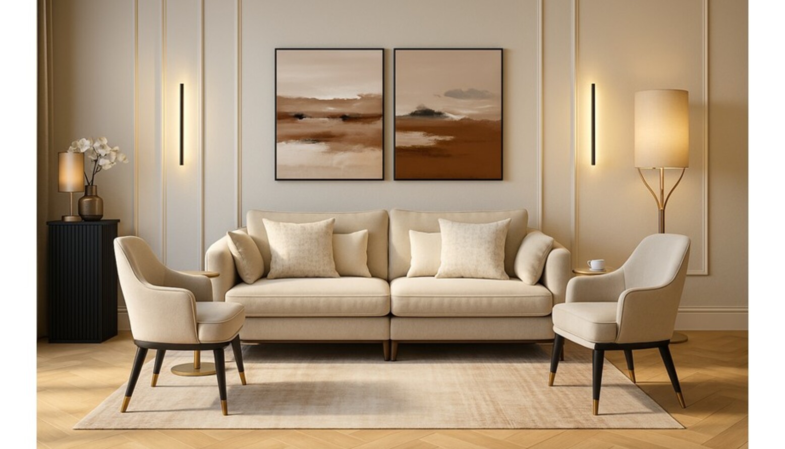 Artwork plays a pivotal role, with a curated collection including a heavy textured framed canvas wall art and a set of canvas pieces that echo the room's color palette. Galerie weave wallpaper in natural tones unifies the design, creating an atmosphere of understated luxury.