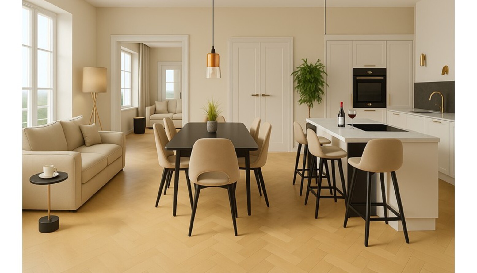 This kitchen and dining room showcases a harmonious blend of comfort and elegance. The centerpiece is a Danetti Morgan extending dining table, crafted from dark washed oak, perfect for hosting family meals. Surrounding the table are chic champagne velvet dining chairs, adding a touch of glam.