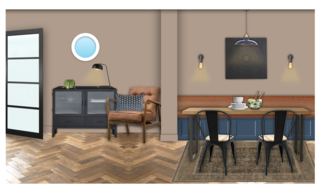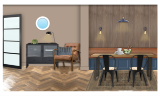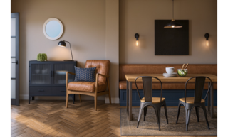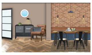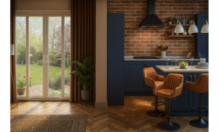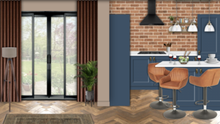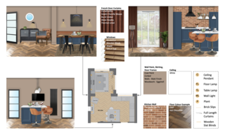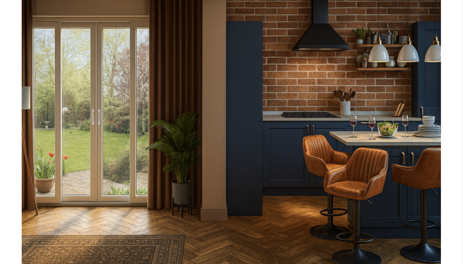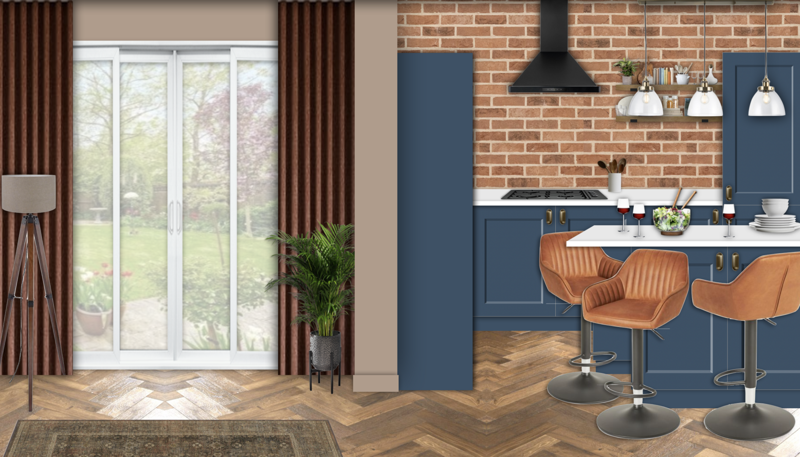 A stylish kitchen dining room that combines functionality and aesthetics. The focal point is the striking brick wall, which adds a rustic charm while contrasting with the sleek blue cabinetry. Below, a wooden countertop provides ample workspace.